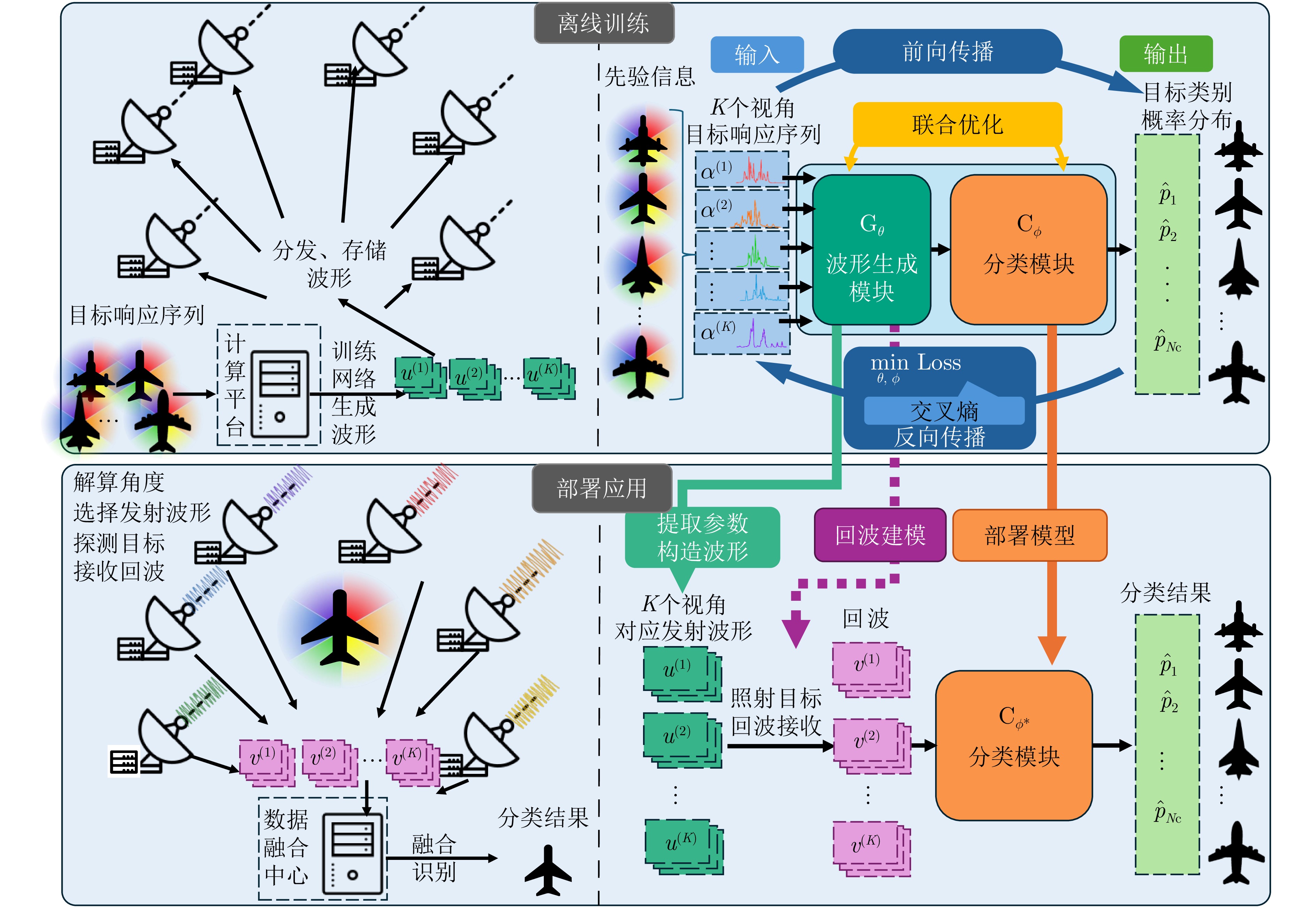 The automatic target recognition performance of radar is critically dependent on the quality of features extracted from target echo signals. As the information carrier that actively shapes echo signals, the transmitted waveform substantially affects the target classification performance. However, conventional waveform design is often decoupled from classifier optimization, thereby ignoring the critical synergy between the two. This disconnect, combined with the lack of a direct link between waveform optimization criteria and task-specific classification metrics, limits the target classification performance. Most existing approaches are confined to monostatic radar models. Further, they fail to establish relationships between the target’s aspect angle, the transmitted waveform, and classification performance, and lack a cooperative waveform design mechanism among nodes. Hence, they are unable to achieve spatial and waveform diversity gains. To overcome these limitations, this paper proposes an end-to-end “waveform aspect matching” optimization framework for target classification in distributed radar systems. This framework parameterizes the waveform as a trainable waveform generation module, cascaded with a downstream classification network. This transforms the isolated waveform design problem into a joint optimization of the waveform and classifier, directly guided by the classification task. Leveraging prior target information, the model is trained to jointly optimize and produce aspect-matched waveforms along with the corresponding classification network. Furthermore, to enhance the classification performance in distributed radar systems, a dual-branch network based on noncausal state-space duality modules is proposed to extract and fuse multiview information. Experimental results demonstrate that the proposed method can synergistically utilize waveform and spatial diversity to improve the target classification performance. It demonstrates robustness against node failures, offering a novel solution for intelligent waveform design in distributed radar systems.