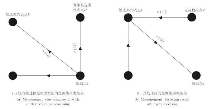 (2)去除杂波量测。选取合适的密度阈值γ,如果$f_{_{{\rm{Gauss}}}}^{\rm{D}}{\rm{ \ \ (}}z{\rm{) < }}\tau $,设定$z$为杂波量测,并将其从量测集中删除,否则,认为$z$为由目标产生的量测。其中,t的取值可采用如下方法,先分别找出量测的缩小最大密度${f_{\max }}$和最小密度${f_{\min }}$;将密度区间$\left[ {{f_{\max }}{f_{\min }}} \right]$分成$N_z$等份,$N_z$为量测数,统计每个等分区间内包含量测的个数,寻找含有最少量测(或不含量测)的密度区间,将该区间内的任意密度值作为密度阈值$\tau $。 3.3 近邻传播聚类算法