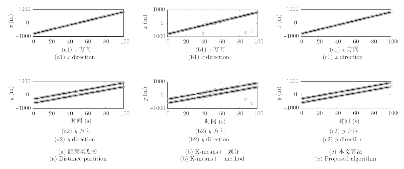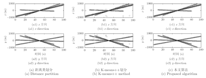 图 3为扩展目标分别在x和y方向上的真实运动轨迹和量测。图 4(a),图 4(b),图 4(c)分别表示距离划分、K-means++划分和AP聚类划分的目标状态估计。从图中可以明显看出,本文算法与距离划分算法的多扩展目标跟踪精度相当,而K-means++方法划分的跟踪精度最差,主要是因为K-means++方法对初始聚类中心的要求比较高,且对杂波比较敏感,导致量测划分不准确,影响滤波结果。