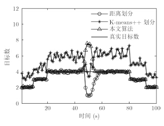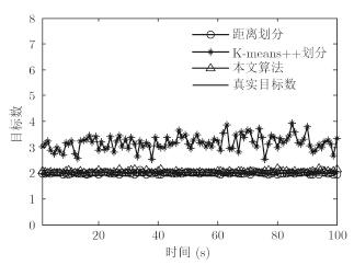 第50时刻,由于扩展目标交叉,量测集部分重叠在一起,导致量测很难被准确划分。由图 5可以看出,在第50s时,3种算法对目标数的估计都不准确。图 6给出了3种算法的OSPA距离比较,可以看出,本文算法与距离划分算法的精度相当,都明显好于K-means++算法。
