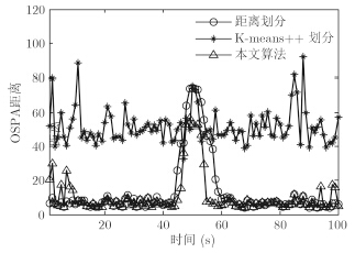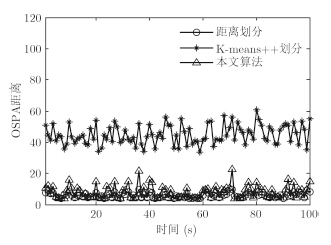 本文将所提算法与传统的距离划分[8]和K-means++划分[8]作性能对比分析,其中,3种算法都在扩展目标高斯混合PHD(ET-GMPHD)的滤波框架[8]下实现。采用OSPA距离作为多扩展目标跟踪精度的评价指标之一,其定义如下[16]: