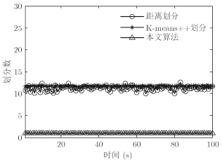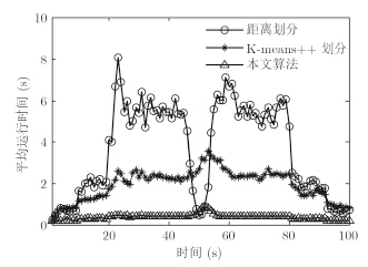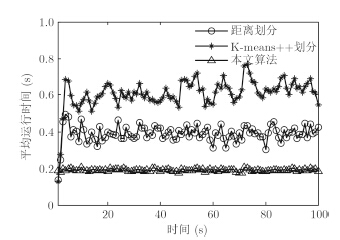 图 7和图 8表示量测的划分数和算法的平均运行时间。可以看出,由于距离划分算法中,事先根据经验设定距离子集,并遍历距离集划分量测,导致量测划分数最大,从而导致该算法整体运行时间最长;而对K-means++划分,很难确定K的取值范围,导致量测划分数也比较多;本文算法的量测划分数最小,因为本文算法中首先采用量测密度技术滤除了杂波点,并在AP聚类选用自适应P值进行聚类,大大减少了量测集的划分数目,在不降低滤波精度的情况下,大大缩短了算法的运行时间。