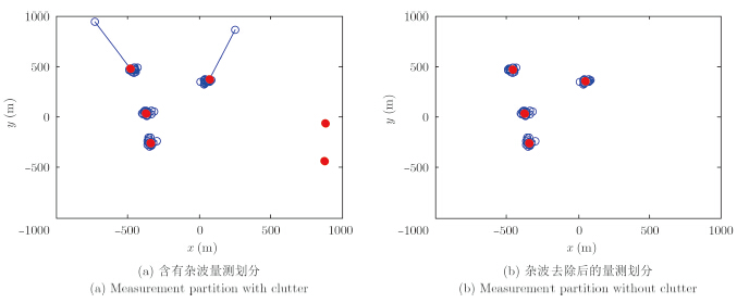 图 2为扩展目标跟踪场景中单帧量测数据聚类结果,其中,图 2(a)为没有经过预处理含杂波的量测集聚类结果,图 2(b)为预处理后的量测聚类结果。可以看出,杂波点对AP算法存在一定的干扰,经过量测杂波预处理,AP算法可以较好地划分扩展目标的量测数据,且聚类中心要略好于有杂波干扰的聚类结果。所以本文算法中,先对量测进行预处理,降低杂波对AP算法的干扰,以提高算法的跟踪性能。