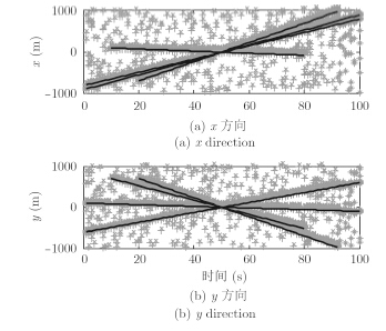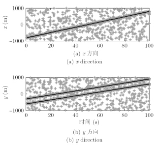 假设新生目标随机集的强度函数为: ${D_b}(x) \!\! =\!\! 0.1N\left( {x ;m_{_b}^{(1)},{P_b}} \right) + 0.1N\left( {x ;m_{_b}^{(2)},{P_b}} \right) \!\!+\!\! 0.1N\left( {x ;m_{_b}^{(3)},{P_b}} \right) \!\!+ 0.1N\left( {x ;m_{_b}^{(4)},{P_b}} \right)$。其中,$m_{_b}^{(1)}{\rm{ = }}{\left[ { - 800 - 600 \;\; 0 \;\; 0} \right]^\rm T},m_{_b}^{(2)}{\rm{ = }}{\left[ { - 900 \;\; 100 \;\; 0 \;\; 0} \right]^\rm T},m_{_b}^{(3)}{\rm{ = }}{\left[ { - 700 \;\; 700 \;\; 0 \;\; 0} \right]^\rm T},$ $m_{_b}^{(4)}{\rm{ = }}{\left[ { - 100 \;\; 700 \;\; 0 \;\; 0} \right]^\rm T},{P_b} = \rm{diag}\left( {\left[ {100 \;\; 100 \;\; 25 \;\; 25} \right]} \right)$。