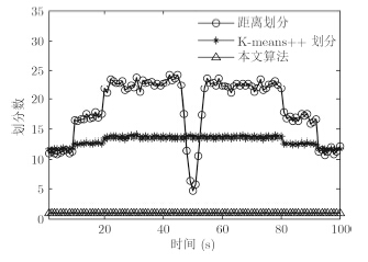 图 9给出量测及目标在x轴和y轴上的运动轨迹,图 10(a),图 10(b),图 10(c)分别为距离划分、K-means++划分和本文算法的目标状态估计。图 11和图 12分别给出了采用3种算法对目标数的估计和OSPA距离统计的对比图。图 13和图 14分别为3种算法的划分数和平均运行时间的对比图。从实验结果可以看出,本文算法与基于距离划分算法的精度相当,K-means++划分的跟踪效果最差。从运行时间上来说,提出算法的运行时间明显要低于其他两种算法,具有较好的实时性。