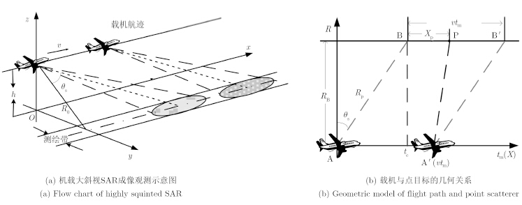 合成孔径雷达( Synthetic Aperture Radar,SAR)采用脉冲压缩技术和合成孔径原理可实现对地面场景的成像,该成像具有全天候、全天时、远距离和宽测绘带的特点,因此在环境监测、资源勘查、测绘以及战场侦查等领域都发挥着重要作用[1]。与正侧视SAR成像相比,斜视SAR成像在实用中具有更好的机动性。它通过改变天线波束的指向,可以对前方目标预先成像,对后方目标再次成像,从而便于在军事上实现实时侦察与打击、重访热点地区[2, 3, 4, 5]。因此斜视SAR具有很高的军事价值,已经成为SAR成像技术的研究热点。