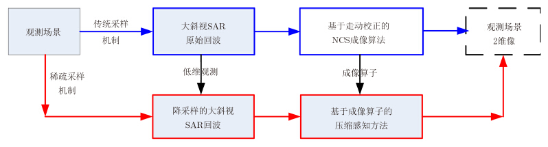 压缩感知理论是由D. Donoho,E. Candes及华裔科学家T. Tao等人于2006年提出的,该理论表明,可以从严重降采样的数据中实现稀疏信号与数据以高概率的完美重构[6, 7]。研究人员基于该特性将压缩感知理论应用于SAR成像中,进行SAR回波数据的压缩与成像处理,并取得了一定的成果[8, 9, 10, 11, 12, 13, 14]。美国的Patel提出了一种基于压缩感知的SAR成像技术,利用少量的方位采样数据重建场景图像[8]。西班牙的Alonso利用压缩感知处理取代传统的匹配滤波处理,在大幅减少SAR脉冲数的基础上实现了准确成像[9]。土耳其的Cetin提出了一种场景幅度稀疏信息的SAR重建方法,通过联合优化问题求解重建场景幅度并估计场景相位[10]。中科院电子所吴一戎院士团队研究了稀疏微波成像技术的理论体系,并论述了稀疏微波成像典型应用的研究进展[11, 12]。国防科学技术大学的杨俊刚博士研究了随机频率信号的SAR成像,通过两维随机采样大幅减少了SAR成像的回波数据和频率资源[13]。西安交通大学的方健博士基于距离多普勒成像算法提出了一种快速压缩感知SAR成像方法,能够在大幅减少回波采样数情况下实现高质量成像[14]。北京航空航天大学的孙进平研究员提出了基于Poisson disk的非均匀采样的SAR成像方法[15],有效减少了脉冲重复频率实现了宽幅高分辨成像。