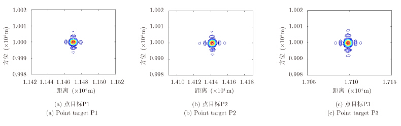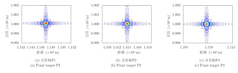 4 仿真试验 4.1 点目标仿真分析首先采用3个点目标,分别为近距点P1,中心点P2以及远距点P3对本文2.2节提出的基于走动校正的大斜视SAR成像方法进行验证。3个点目标的布置方式以及与SAR系统的位置关系如图 3所示。SAR系统以大斜视条带模式工作,斜视角${\theta _{\rm{s}}}$为45°,中心斜距Rp为14.14 km,雷达工作在X波段(波长为0.03 m),飞行速度v=100 m/s。观测场景的大小为5 km×5 km,其中心点与载机航迹的最近距离R0为10 km。发射信号为LFM信号,脉冲宽度为10 μs,带宽Ba为50 MHz,获得的距离向分辨率为3 m。