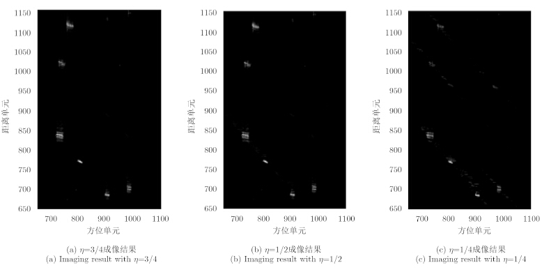 为了说明本文方法的有效性,首先对稀疏性观测场景进行成像处理。观测场景采用RADARSAT-1数据成像结果中的海湾舰船目标部分进行仿真验证,雷达系统的参数设置以及成像场景与雷达的位置关系与单点目标仿真实验一致。在回波数据全采样的条件下,利用2.2节提出的成像方法得到的成像结果如图 6(a)所示,图 6(b)是经过几何形变校正之后的结果。进一步设定大斜视SAR回波数据的采样率$\eta$分别为3/4,1/2和1/4。对于降采样的数据如果仍然采用2.2节提出的成像方法得到的结果如图 6(c)所示,可见明显具有较高的旁瓣,无法获得观测场景信息。利用第3节所提的压缩感知成像方法对降采样数据进行成像处理,得到的结果分别如图 7(a),图 7(b)和图 7(c)所示(成像结果已完成几何形变校正处理)。可以看出图 7(a)和图 7(b)的成像结果旁瓣明显低于图 6(b)的成像结果。而图 7(c)由于降采样率$\eta$较小,重构出了部分的虚假点,但是主要的散射点不受影响,还是能够得到观测场景主要信息。
