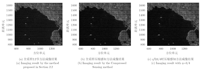 下面对非稀疏观测场景进行成像处理。观测场景采用RADARSAT-1数据成像结果中含有陆地场景部分进行仿真验证,雷达系统的参数设置以及成像场景与雷达的位置关系与上述仿真实验一致。在回波数据全采样的条件下,利用2.2节提出的成像方法和压缩感知成像方法得到的观测场景成像结果分别如图 8(a)和图 8(b)所示(成像结果已完成几何形变校正处理)。设定降采样率$\eta$为3/4,利用本文压缩感知成像方法得到的结果如图 8(c)所示,可以看出在全采样条件下两种方法均可以获得较好的成像结果,但是在降采样条件下无法获得较好的结果。说明了本文压缩感知方法在满采样的条件下能够实现对非稀疏场景的成像处理。