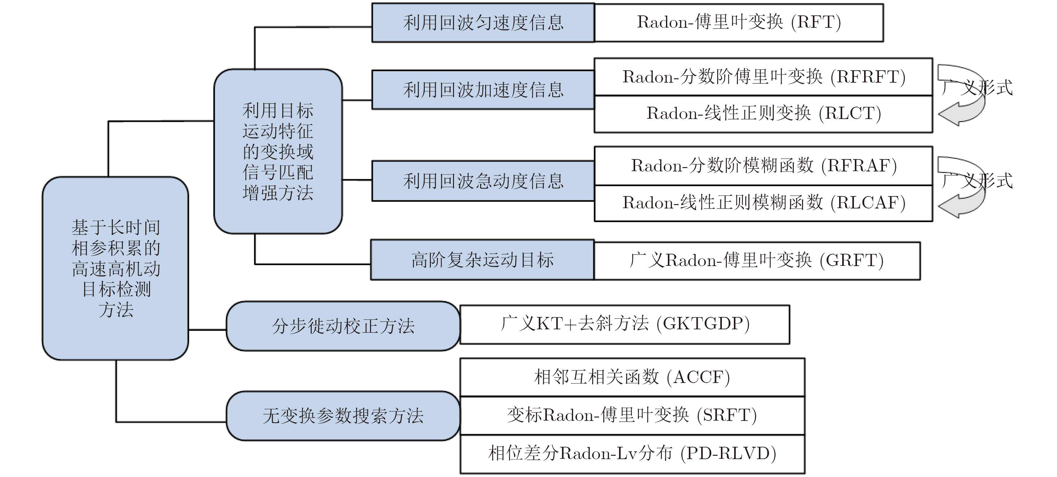 2.3 基于长时间积累的高速高机动目标检测方法具有低可观测性的运动目标在距离和多普勒分辨单元中往往具有较低的SNR/SCR,降低了雷达的检测性能[29]。在雷达信号处理中,通常可以延长积累时间以增加目标的能量,达到改善信号SNR/SCR的目的[30]。然而,对于常规机械扫描雷达,波束在每个指向的驻留时间有限,因此积累脉冲数有限。数字相控阵雷达和多输入多输出(Multiple-Input Multiple-Output, MIMO)雷达增加了波束的驻留时间,为目标的长时间积累提供了可能性。值得注意的是,在实际应用中,积累时间的长短是一个相对的概念,取决于雷达观测模式、波束驻留时间、重复频率和采样频率等多种因素。针对目标的不同运动类型,积累时间也是不同的。