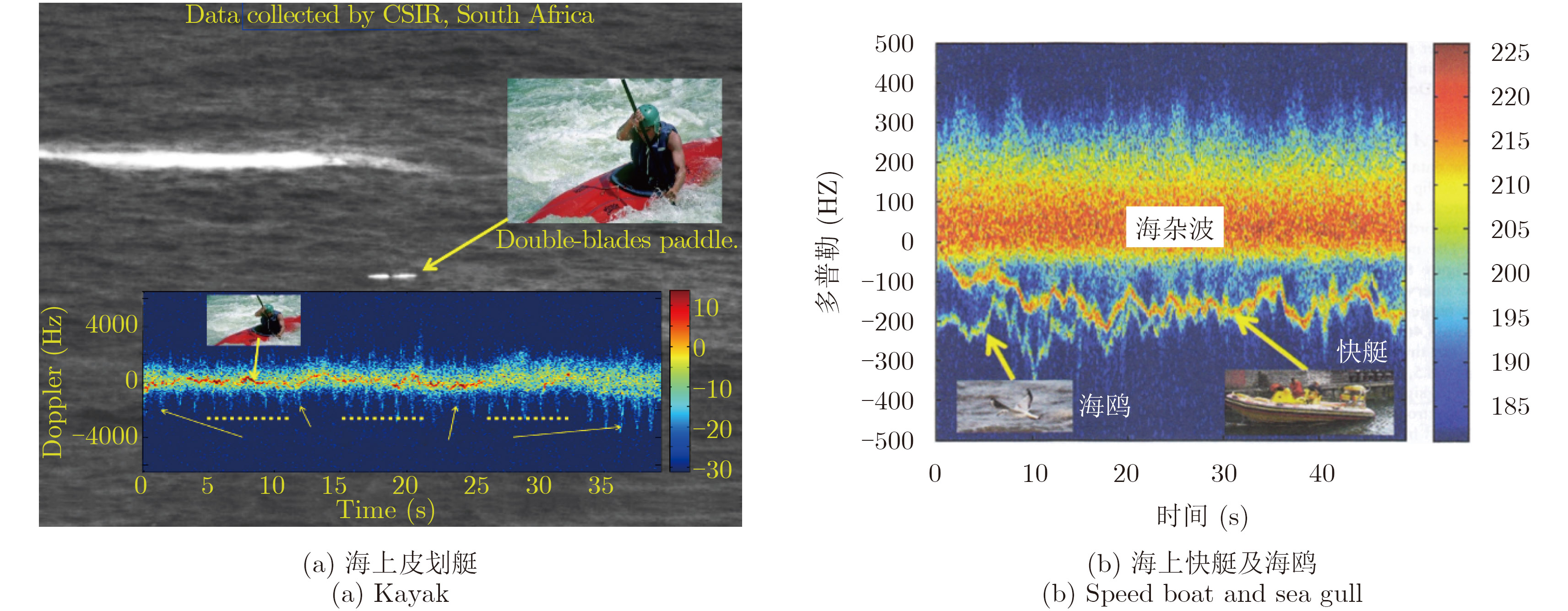 3.3 稀疏域微动目标检测及特征提取在实际中,目标的运动状态复杂多样,尤其是海上低可观测目标。一方面,海杂波的存在降低了回波信号的SCR;另一方面,由于海面波动以及目标本身推动力的作用或机动,目标不仅存在平动,还绕参考点作三轴转动,导致回波多普勒频率随时间非线性变化。因此,新的检测算法应能适用于时变和非平稳信号的处理,提取信号的精细特征。近年来,微多普勒(Micro-Doppler, M-D)理论为非平稳信号的分析和处理提供了新的思路[54],研究表明,微多普勒适合分析海上目标回波信号,不仅拓展了信号维度,还能提取更多有用信息,从而进一步提升雷达检测能力[3]。图6给出了典型海上目标的微动特性(皮划艇、快艇及海鸥)。微多普勒理论“创始人”Victor C. Chen教授[55]在《Radar Micro-Doppler Signature: Processing and Applications》中将海面目标的复杂运动作为微动特性分析的重要研究内容,值得深入研究。2015年,《IET Radar, Sonar & Navigation》出版了微多普勒的专刊,重点提到“海杂波剧烈变化,海面目标受海况的影响也具有微动特性”[41]。信号时频处理方法作为微动特征分析工具具有一定的优势,但估计性能受时频分辨率的限制。目标雷达回波可视为少数强散射中心回波的叠加,回波具有稀疏特性,因此,采用稀疏表示的方法分析微动信号,并进行参数估计是非常适合的[56]。