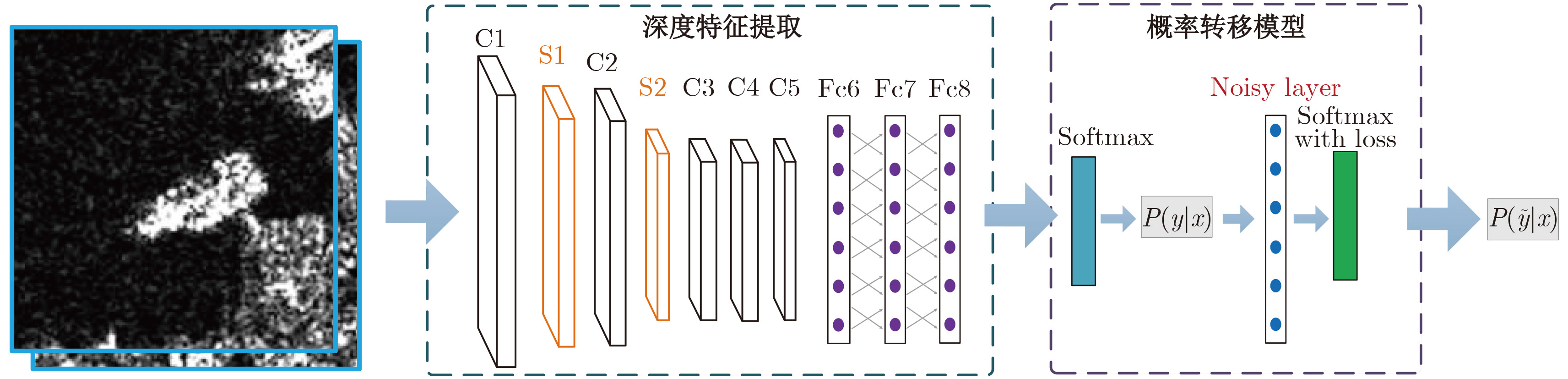 虽然CNN在SAR图像分类中取得了较好的效果,但是这种监督学习方法需要大规模、正确标注的训练样本[14]。然而SAR特殊的成像机理(相干成像、主动式、微波波段等)使得图像存在严重的相干斑噪声、几何畸变与结构缺失现象,图像非直观性强、理解难度大,即使经验丰富的判读专家也需要借助丰富的先验信息才能对SAR图像进行准确判读;对于非合作目标,先验信息的缺乏极易导致图像错标。SAR图像中这种观测样本与其标注不一致的现象造成SAR图像解译中的含噪标记问题。在SAR图像分类中,直接使用含噪标记样本进行监督学习,必然会使得分类性能下降、模型复杂度上升和过拟合问题[15]。目前,含噪标记条件下的图像分类问题在计算机视觉和机器学习领域也逐渐引起重视,主要的解决方法是通过改进损失函数的正则化约束项来提高分类器对噪声标记的鲁棒性[15,16],而且这些方法基于人工设计的特征,且特征提取与分类器训练分阶段进行,并不具备特征学习的能力,使得分类性能和对噪声标记的鲁棒性进一步降低。而近年来兴起的CNN等深度模型由于参数多,虽然具有更强特征学习和表达能力,但更容易受到噪声标记的影响。