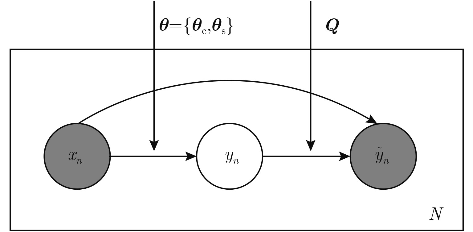 $\begin{aligned}P\left( {{{\tilde y}_n}\! =\! j|{x_n}} \right)\! & =\! \sum\limits_i {P\left( {{{\tilde y}_n} \!= \!j|{y_n} = i} \right)P\left( {{y_n} \!= \!i|{x_n}} \right)}\! \\ & =\sum\limits_i {{q_{ji}}P\left( {{y_n} = i|{x_n}} \right)} \end{aligned}$ | (3) |