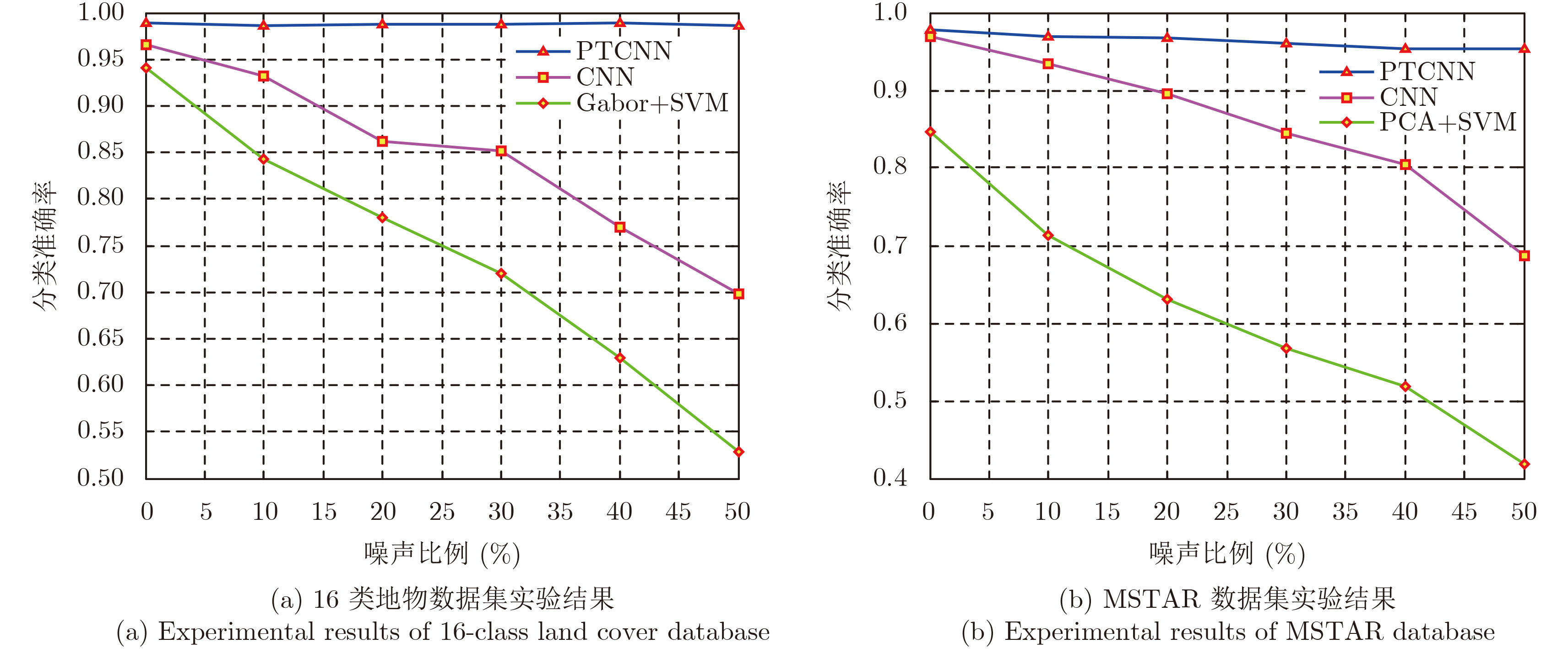 MSTAR数据集对车辆目标分类的过程中,参数衰减系数设置为0.004,网络学习率采用步进式策略,基础学习率设为0.001,每迭代500次学习速率更新1次,各层权重与偏置更新策略采用基于动量(momentum)法的SGD算法,动量设置为0.9,最大迭代次数设置为20000次,直至目标函数收敛。不同噪声比例下MSTAR车辆目标分类准确率如表5所示,同样可以看出,不同噪声比例下PTCNN模型对车辆目标的分类准确率优于经典CNN模型,而经典CNN模型分类性能又优于基于PCA特征的SVM算法。