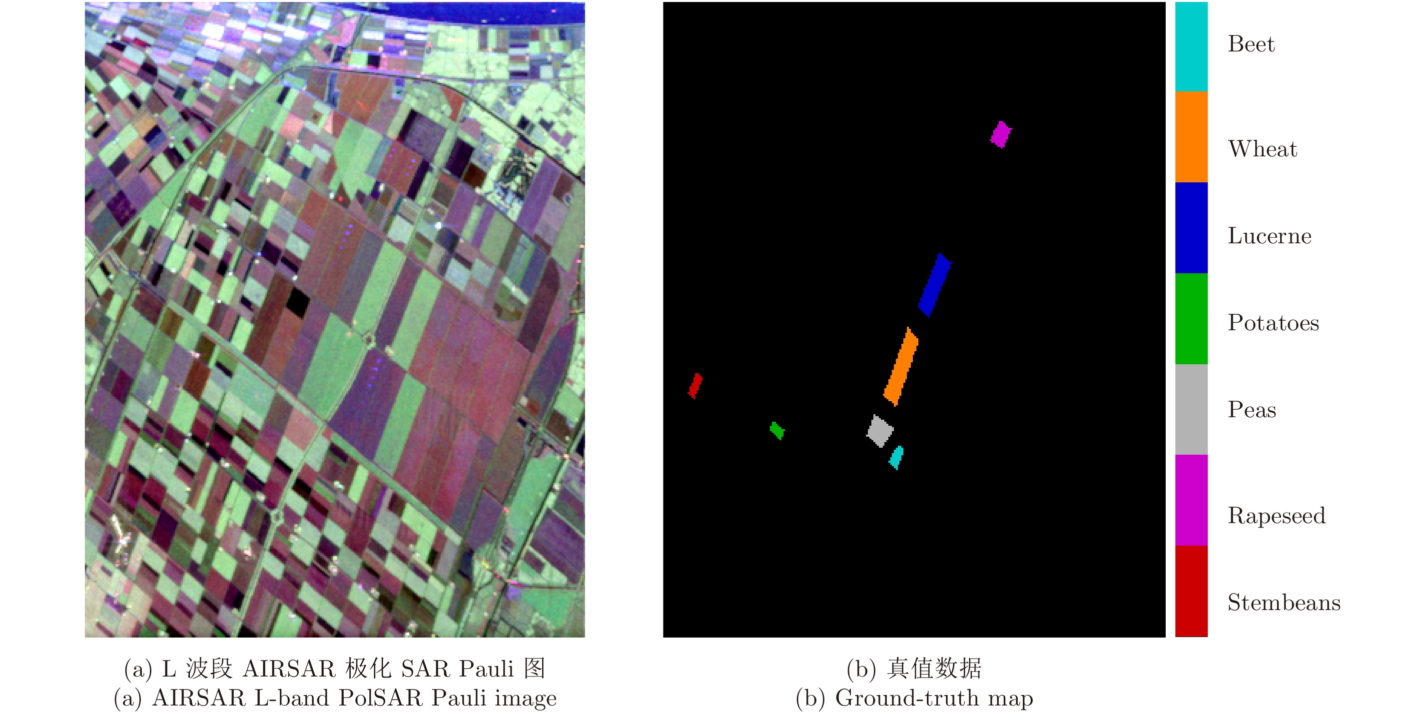 利用AIRSAR在荷兰Flevoland获得的L波段极化SAR数据验证导出的角参数在地物辨识方面的性能。该研究区域包含多种地物,例如农作物、森林、道路、水域等。农作物区域主要包括茎豆、油菜、豌豆、土豆、紫苜蓿、小麦和甜菜等。极化SAR数据由新近提出的SimiTest方法[46]进行相干斑滤波处理,如图1(a)所示。部分农作物的真值图如图1(b)所示。