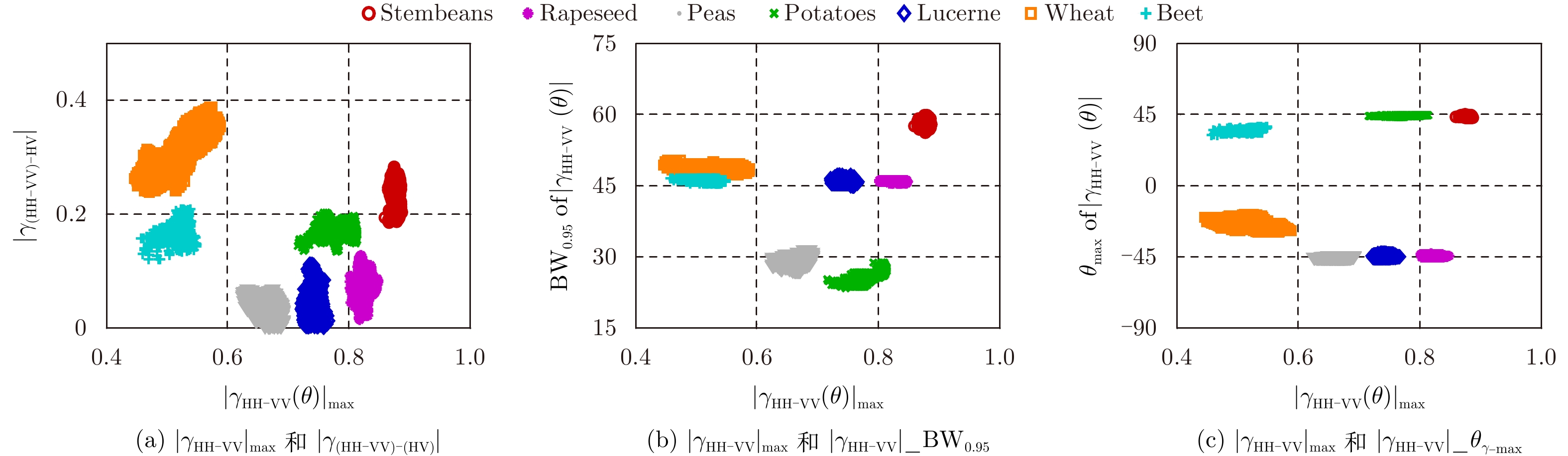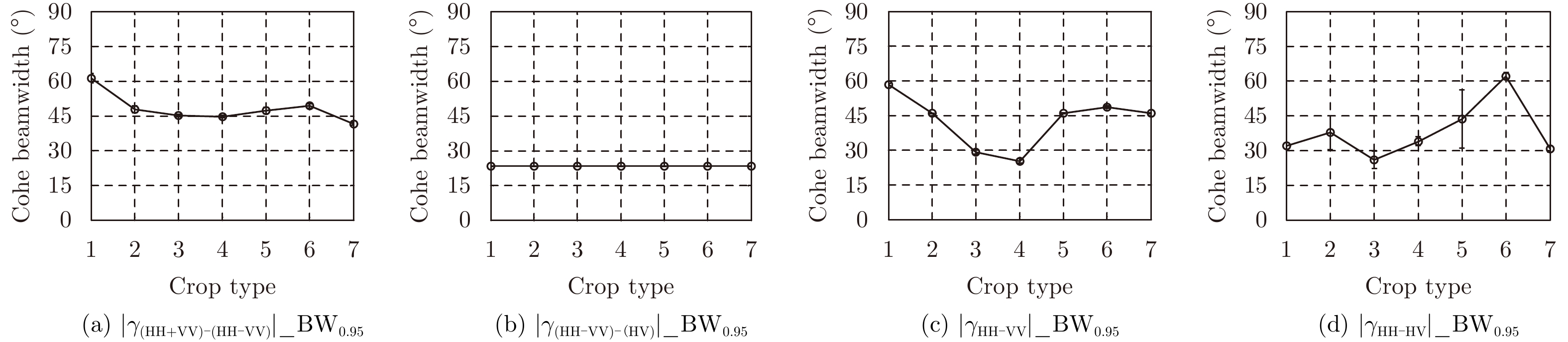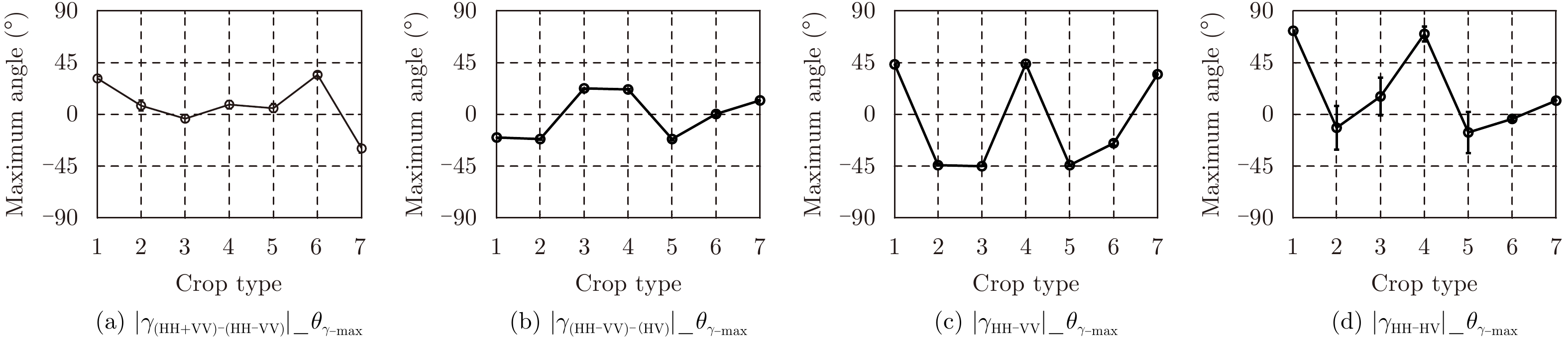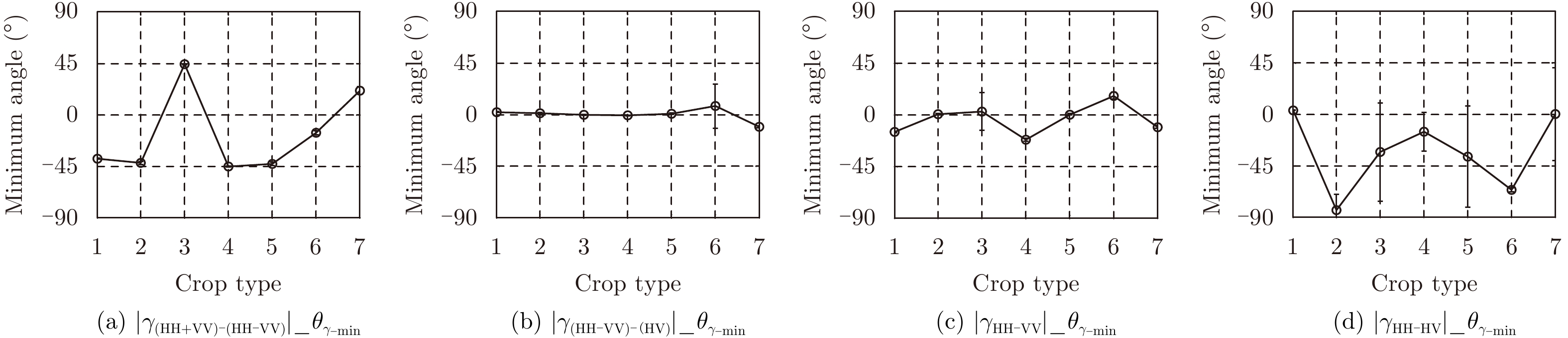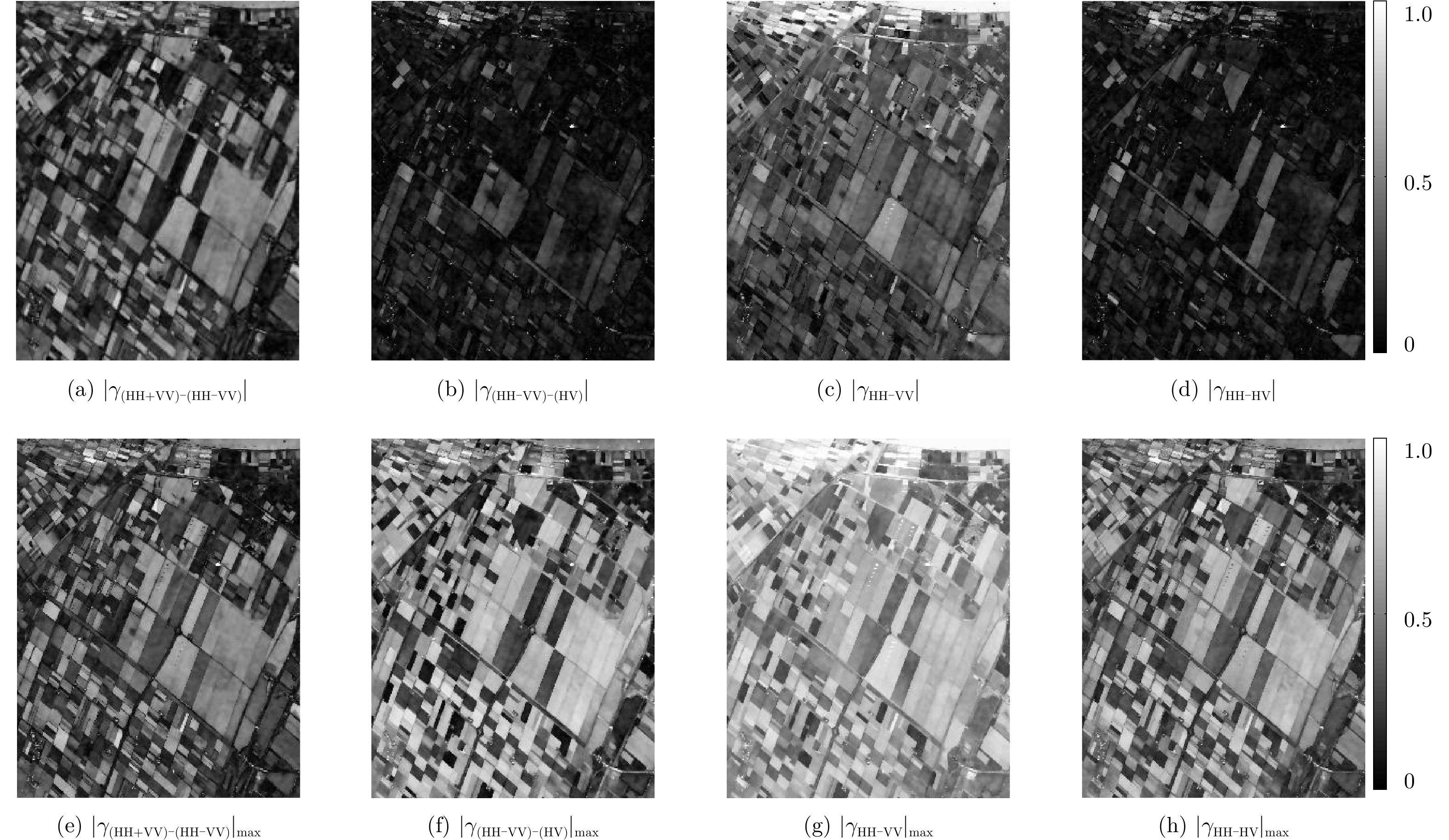 $\begin{aligned}& \left| {{\gamma _{{\rm{HH}} - {\rm{HV}}}}\left( \theta \right)} \right| = \left| {{\gamma _{{\rm{VV}} - {\rm{HV}}}}\left( {\theta + {\rm{{{π}} }}/2} \right)} \right|,\\& \left| {{\gamma _{\left( {{\rm{HH}} + {\rm{VV}}} \right) - \left( {{\rm{HH}} - {\rm{VV}}} \right)}}\left( \theta \right)} \right| = \left| {{\gamma _{\left( {{\rm{HH}} + {\rm{VV}}} \right) - \left( {{\rm{HV}}} \right)}}\left( {\theta + {\rm{{{π}} }}/4} \right)} \right|\end{aligned}$ | (39) |