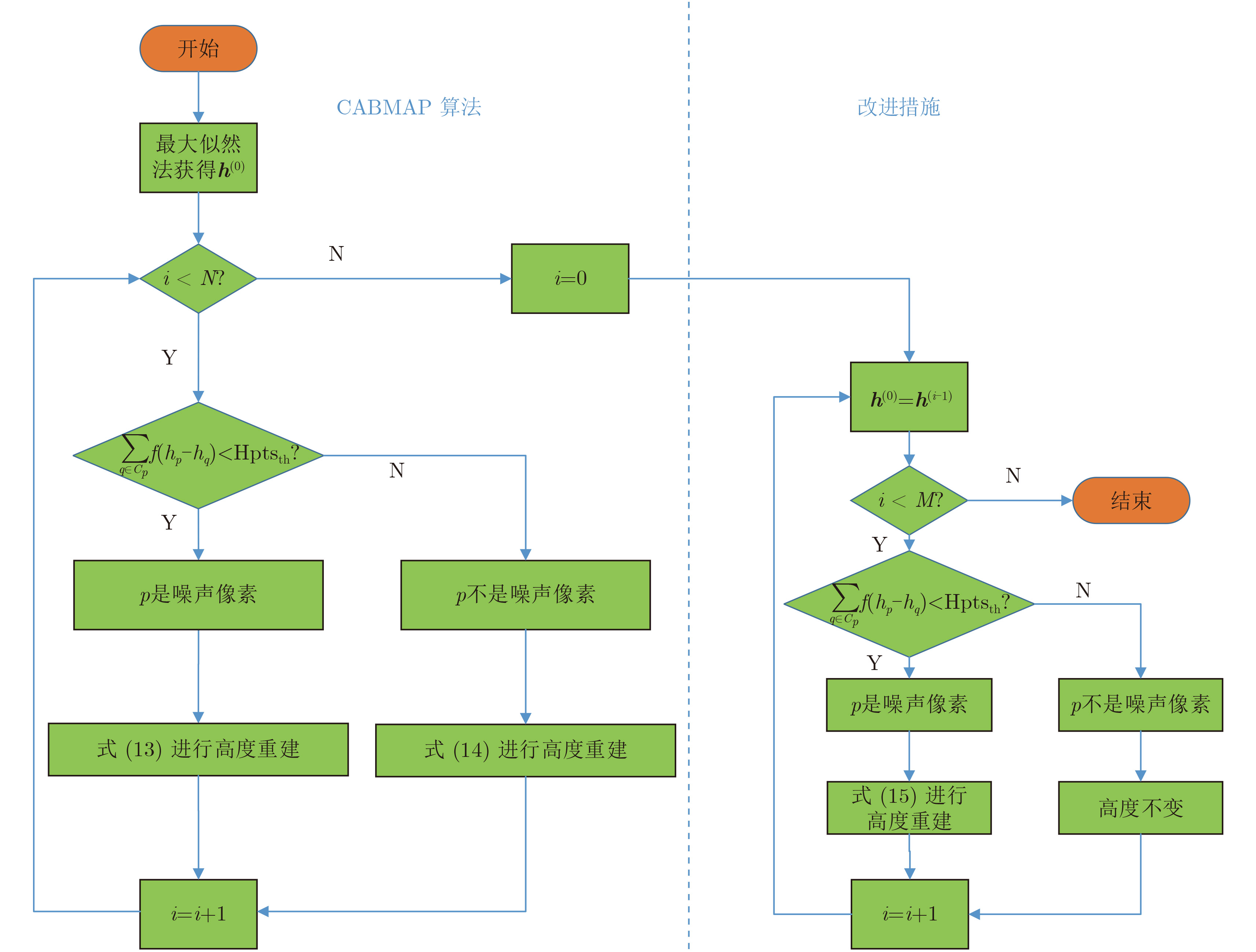 在CABMAP算法中,噪声像素的邻域中每个像素都对其重建有贡献,这种措施利用了噪声像素邻域中所有的像素进行均衡地重建,但却隐含着下列问题:当噪声像素的缠绕相位被严重污染时,后验概率中最大似然项的准确性会大大降低,此时即使利用了噪声像素的邻域特征作为先验项进行弥补,也无法准确地重建高度。为了解决该问题,本文在CABMAP算法的基础上加入了一种改进措施。图2是改进的CABMAP算法的流程图,其中虚线左边是CABMAP算法的流程,虚线右边是改进措施的流程。