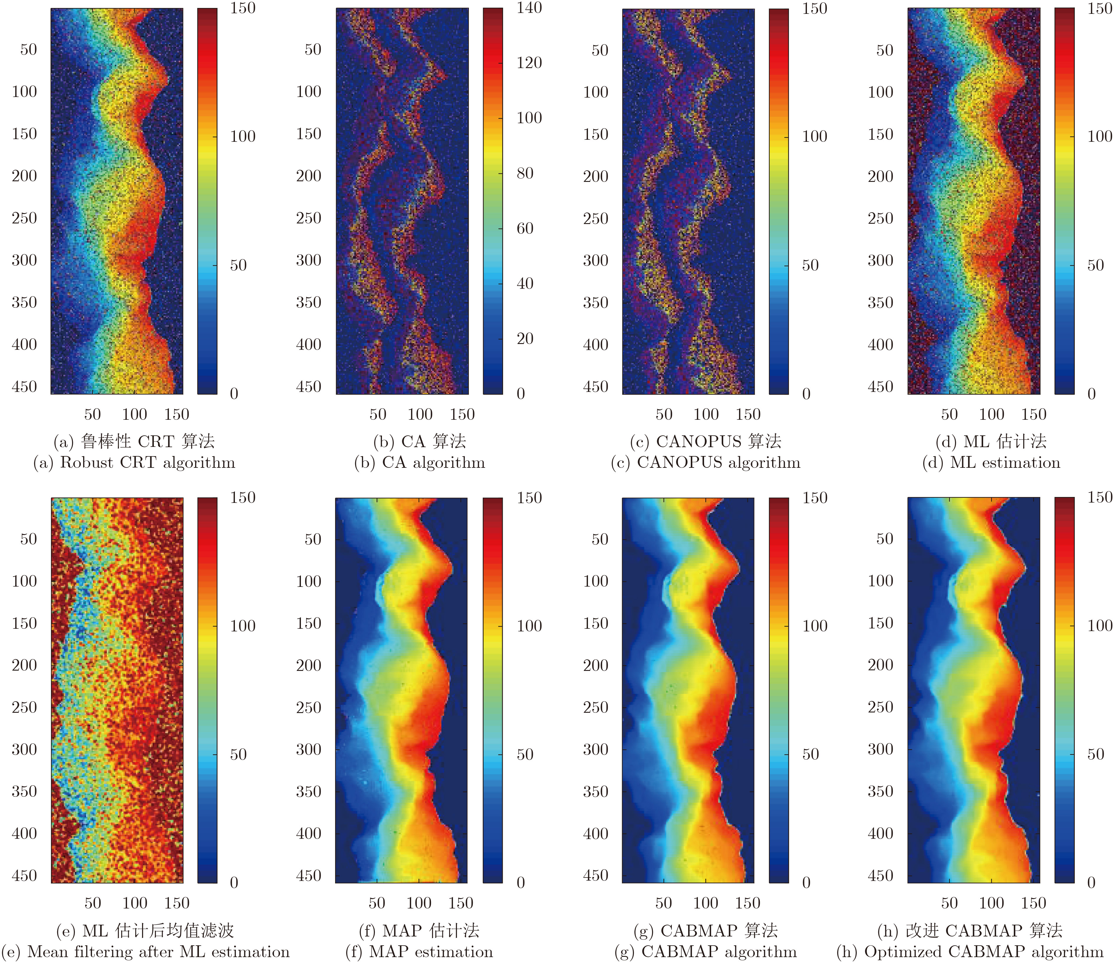 图4(a)–图4(h)分别是鲁棒性CRT, CA, CANOPUS, ML, ML估计后均值滤波、MAP估计、CABMAP及改进措施的高度重建结果。下面分别从精度和运行时间两个方面对上述算法的性能进行分析。采用归一化的均方误差来衡量精度,定义为: