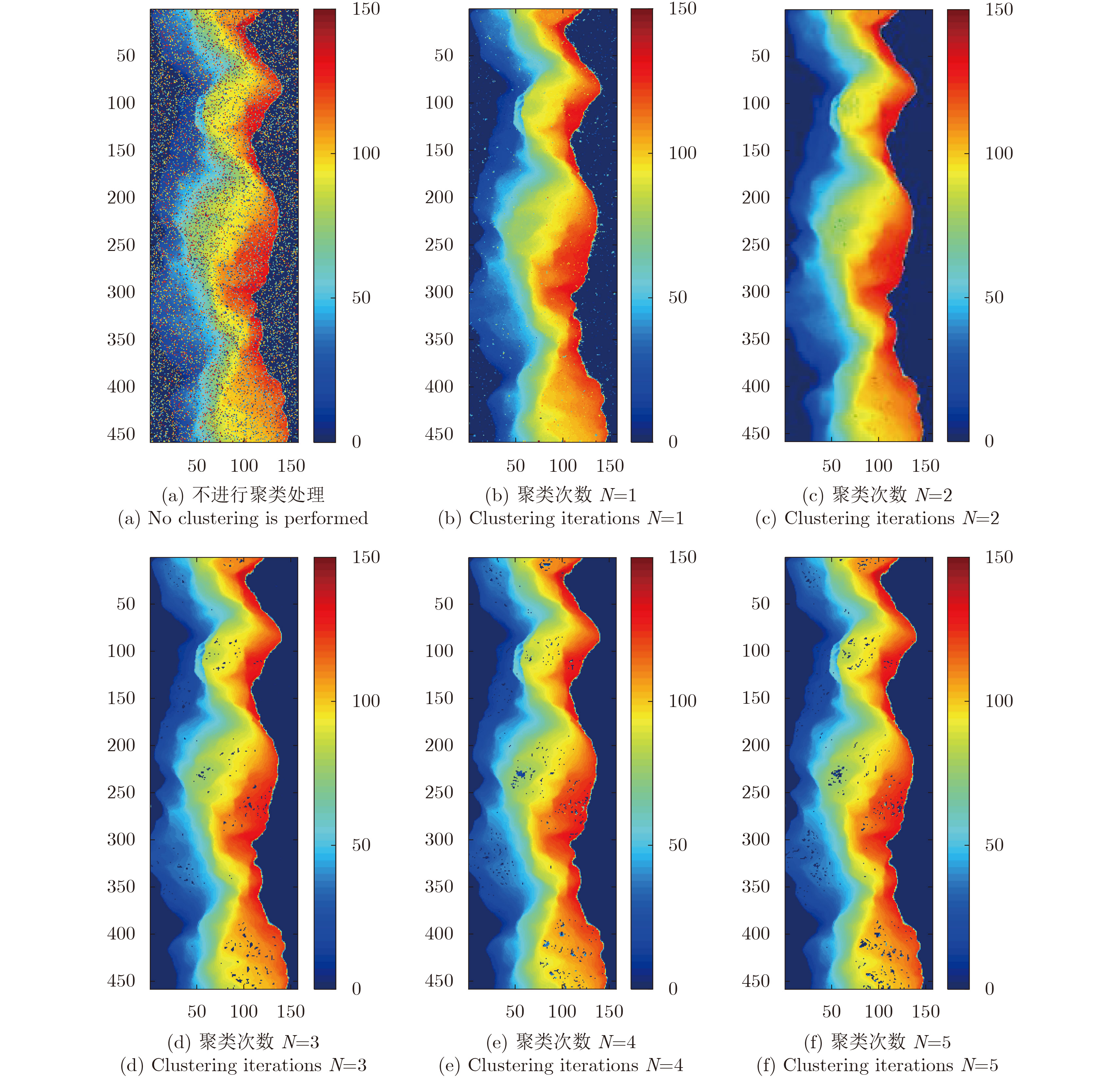 3 CABMAP算法及改进措施 3.1 CABMAP算法基于ML估计的方法运行速度较快但精度较低,而基于MAP估计的方法精度较高、运行速度较慢。结合两种方法的优点,本文提出了CABMAP算法,该算法将ML估计法得到的粗略的地形高度作为初始高度,这样可以减少MAP估计法中重复迭代估计每个像素对应的高程值和超参数的次数,节约了算法的运行时间。将ML估计法得到的结果作为初始高度进行迭代,每次迭代中,利用聚类分析方法判断出噪声像素后利用MAP框架计算后验概率,取最大后验概率对应的高程值为该次迭代的结果,并以该结果为基础进行下一次迭代,直到迭代次数满足设定的阈值后结束算法,得到最终的高度重建结果。