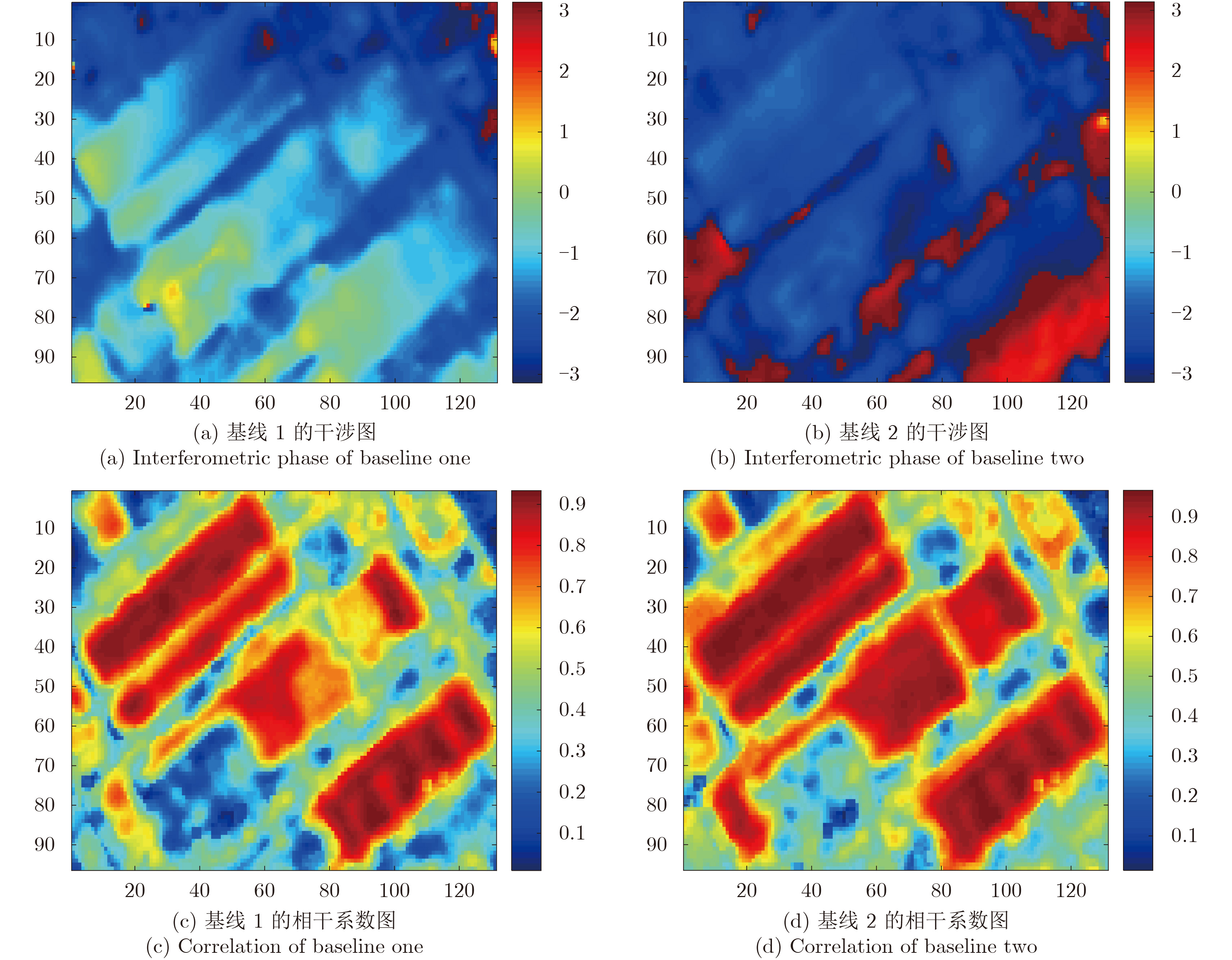 图6(a)、图6(b)分别是基线1和基线2的干涉相位图,由于已经去除平地效应,所以看不见明显的干涉条纹,图6(c)、图6(d)分别是基线1和基线2的相干系数图,可见大部分区域的相干性比较良好,因此适合做干涉处理。