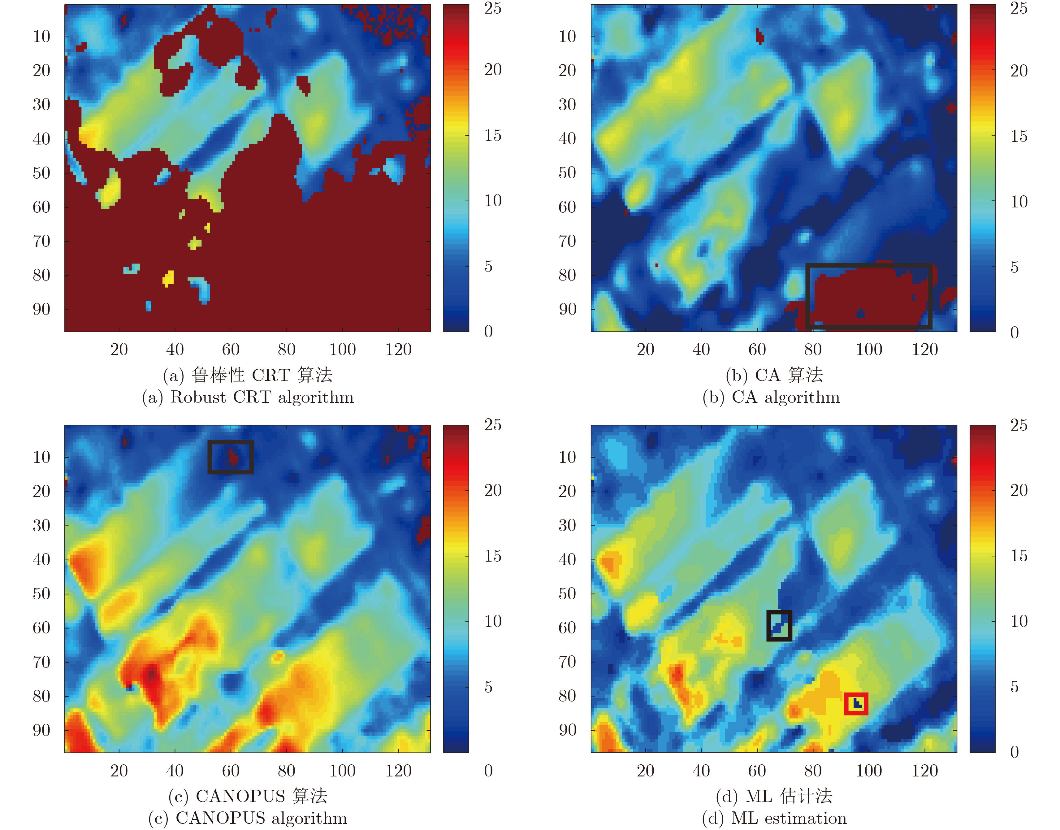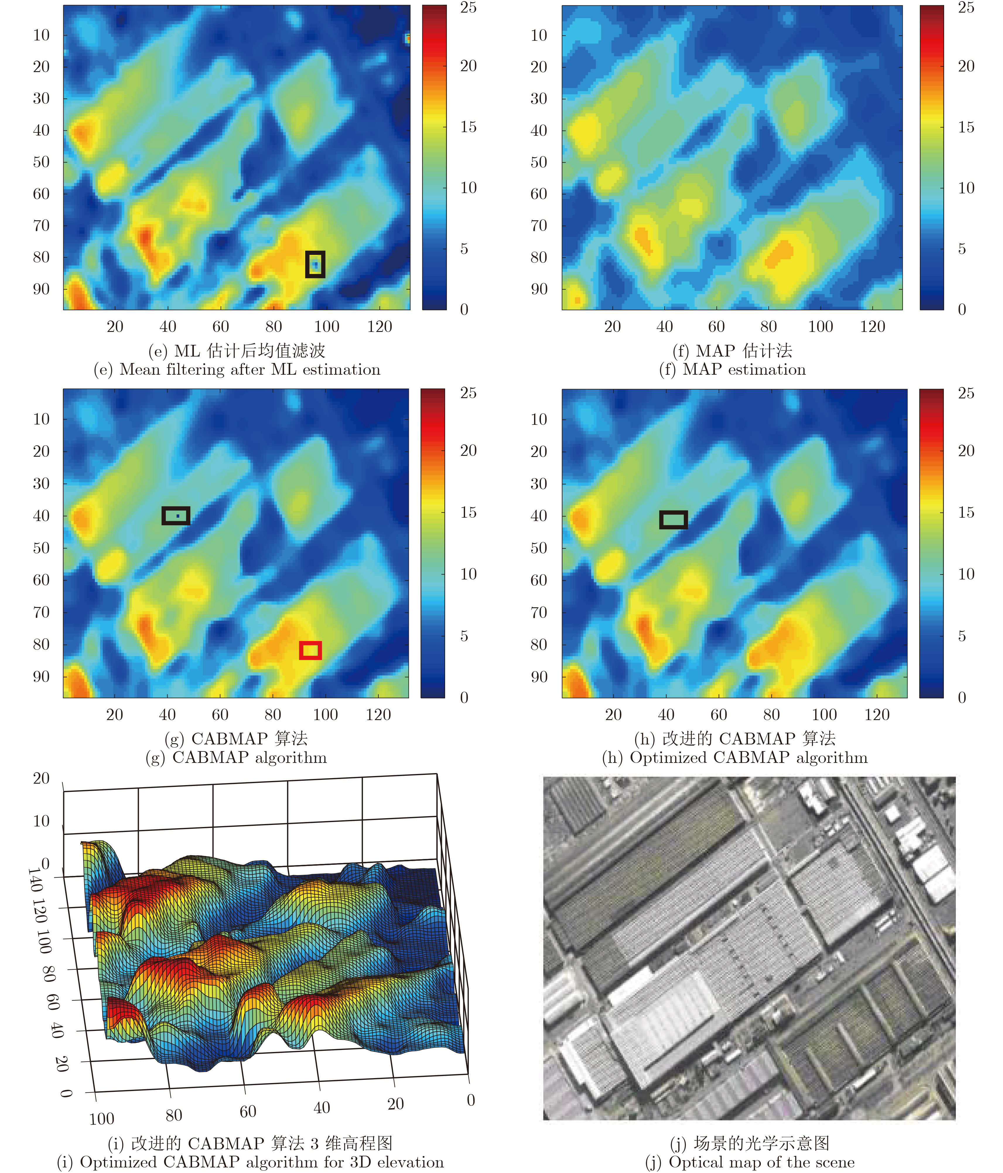 图7(a)–图7(h)分别是鲁棒的CRT, CA, CANOPUS, ML, ML估计后均值滤波、MAP, CABMAP及改进措施的高度重建结果,图7(i)是改进的CABMAP重建结果的3维图,图7(j)是场景的光学图。首先从运行时间方面来分析,CABMAP和MAP估计法的运行时间分别是5.175075 s, 11.617357 s,相比MAP估计法,CABMAP具有较快的处理效率,具体见表8。从精度方面来分析,对比场景的光学图,鲁棒性CRT的结果中场景下部区域没被正确地重建出;CA在较短的运行时间内正确地估计出部分场景的高程信息,但仍有一些区域估计地不准确,如图7(b)中的黑框区域。CANOPUS在CA的基础上,考虑了像素的位置信息,图7(c)中除了较小的黑框区域没被正确地建,整体上比CA的精度更高。ML估计法能在较短的运行时间内估计出精度不错的结果,但在图7(d)中,黑红两块区域产生了较明显的高度突变,对比光学图,这两块区域的估计失真。在ML估计法的结果上加入均值滤波措施后,会将部分孤立的噪声像素过滤掉,但当噪声像素连接成片后,也无法过滤掉这些噪声像素,如图7(e)中的黑框区域。在MAP估计法的结果中,没有出现较明显的高程突变,但建筑物的边缘被模糊化,损失了细节信息。CABMAP的精度较高,对比图7(d)和图7(g)中的红框区域,CABMAP有效地减少了ML估计法中的高程突变点,但仍有部分无法消除,如图7(g)中的黑框区域。改进的CABMAP进一步消除了高程突变点,图7(i)是改进的CABMAP的高程3维图,可以看出该算法在实测数据上也表现出较好的精度。综合来看,本文提出的算法在实测数据处理时表现出较高的处理效率和精度,因此具有良好的实用价值。由于数据有限,该实测数据的不模糊高度大于场景高度差,但能部分验证本文算法,后期条件允许,将进一步验证分析本文算法。