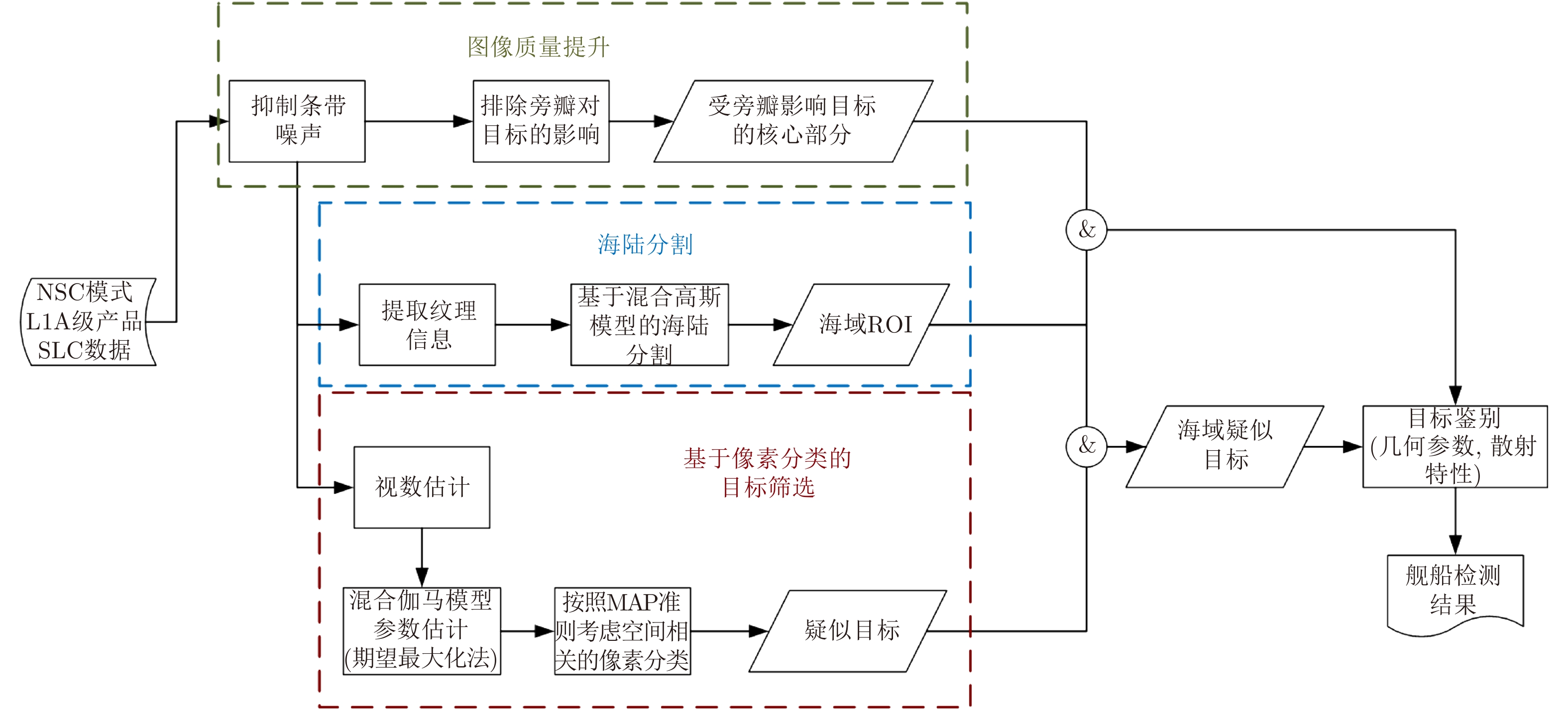 2 方法 2.1 方法概要介绍根据SAR图像的分辨率和图像质量特点,本文提出一种适应NSC模式SAR图像的海面舰船目标检测流程。整个流程如图1所示,包括以下4个主要环节。(1)图像质量提升:本文选取高分三号NSC模式图像中的条带噪声和旁瓣影响因素分别设计图像质量提升方法,提升海面舰船检测流程稳定性和数据适应能力。(2)海陆分割:海陆分割是舰船目标检测的基本前提。复杂海况场景中,依据幅值或强度进行海陆分割在真实数据测试中性能不稳定,可遵循纹理信息进行海陆分割。本文采用局部邻域幅值方差作为衡量纹理强弱的指标,选择混合高斯模型对纹理信息进行建模分类提取海面感兴趣区域(Region Of Interest, ROI)。(3)基于像素分类的目标筛选:本文结合SAR图像统计分布特征和空间邻域相关分析对像素进行分类,并组合目标类像素来筛选得到疑似舰船目标。(4)目标鉴别:在获得海面ROI区域的候选舰船目标后,本文依据目标几何参数(如舰船目标的长、宽等)和散射特性(如幅值,强度等)对虚警进行剔除。对于受旁瓣影响的海域候选目标,我们采图像质量提升步骤中去除旁瓣干扰的目标核心部分来提取几何参数和散射特性,并通过对比实验证明图像质量提升算法对检测性能提高有积极作用。