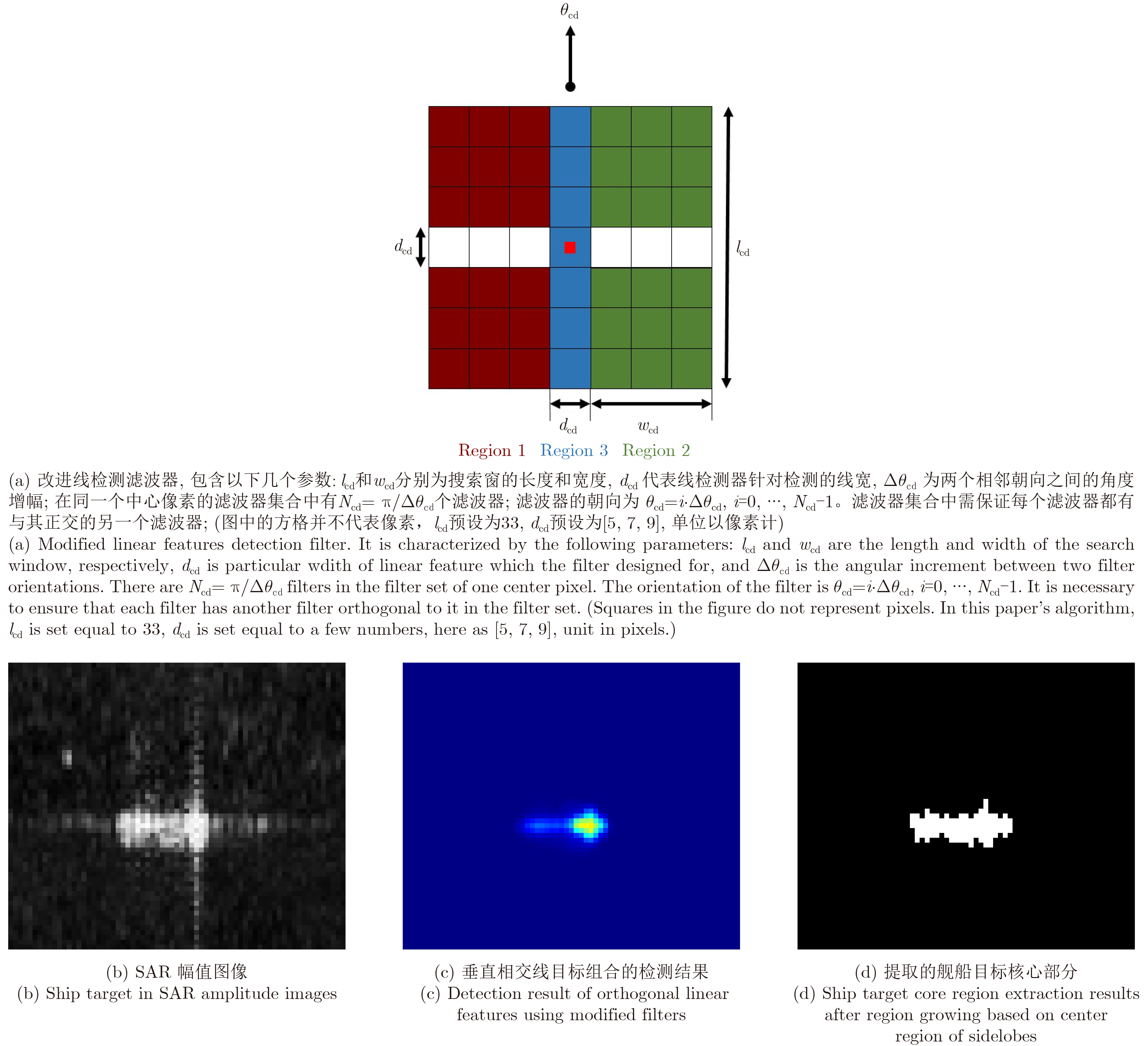 (2) 针对SAR图像舰船目标提取几何参数和散射特性易受旁瓣干扰的问题,本文提出一种“十字”旁瓣定位和提取受旁瓣干扰舰船目标核心区域的质量提升算法,并辅助目标鉴别过程减少漏检。常见方法是基于目标二值分割结果进行形态学滤波或局部插值减弱旁瓣干扰,本文提出一种基于辐射信息排除旁瓣干扰的方法。本文方法排除干扰的同时不改变原本的图像数据,数据不会偏离原有概率分布,对后续统计建模分析有利。SAR图像中影响舰船目标的“十字”旁瓣可以看作是垂直相交的线目标组合。Tupin等[20]设计了一种适合于SAR图像的线检测器,在此基础上我们改进线检测器(如图4(a)所示),无需形状先验,可直接定位“十字”旁瓣;接着按照辐射信息相似的原则进行区域增长;从而,可提取受“十字”旁瓣干扰舰船目标核心部分的连通域,具体效果如图4(b),图4(c),图4(d)所示。通过目标核心部分的连通域能够估计得到更准确的几何参数,从而排除旁瓣对舰船目标的干扰,降低漏检和虚警。