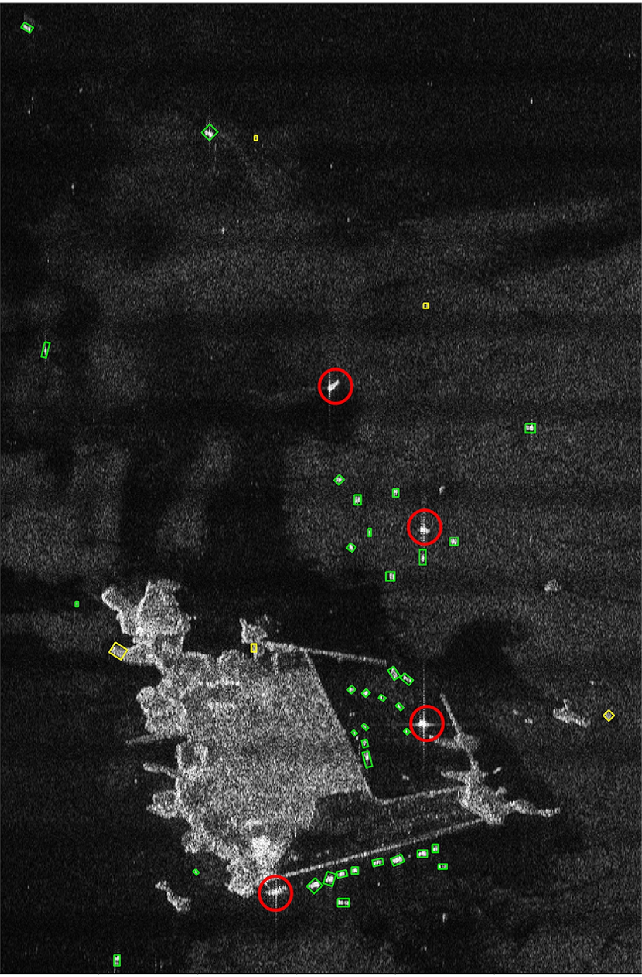 为说明图像质量提升前后本文所提检测方法的性能差距,我们选取了一幅实验图像中典型海域检测结果进行展示。其中的舰船目标真值是40个,图5 为未经过图像质量提升的检测结果,图6 为经过抑制条带噪声和排除“十字”旁瓣干扰后的检测结果。图5和图6中正确检测的舰船目标以绿色矩形框标出,漏检的舰船目标以红色圆圈标出,虚警以黄色矩形框标出。经过图像质量提升后,受“十字”旁瓣干扰造成的漏检减少,仍然存在的漏检是因为靠岸舰船与陆地紧凑相连,在海陆分割的过程中未能将舰船目标与陆地分开。本文主要关注复杂海况条件下海面舰船的检测,针对这点将在结论部分展开阐述。经过图像质量提升后,海面的虚警目标减少,这是因为抑制条带噪声后,混合伽马建模和考虑空域相关的像素分类结果更接近于真实的地物分类情况。