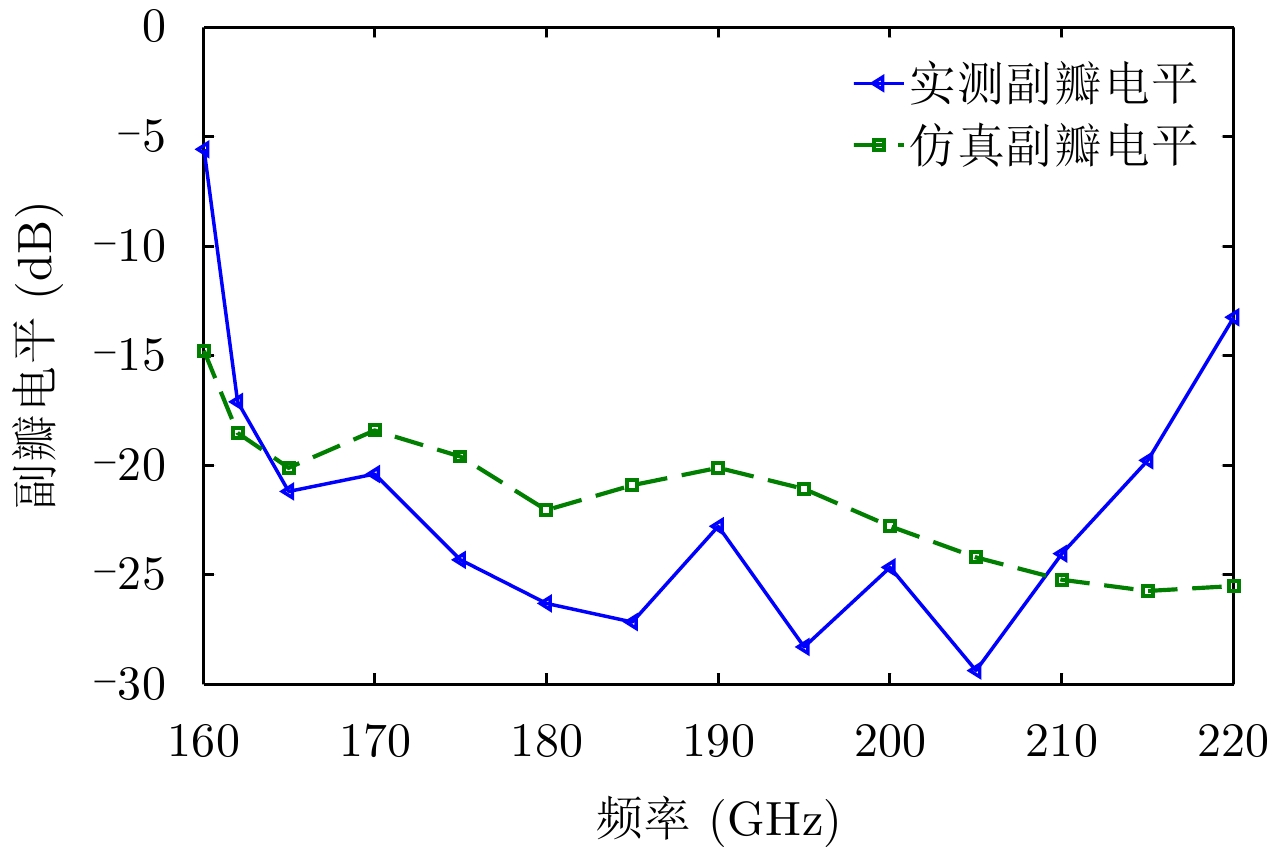 如图10所示仿真与实验副瓣电平对比,在165~215 GHz频段内,仿真副瓣电平在–20 dB附近变化,实验测试的副瓣电平优于–20 dB,在整个频段内在–24 dB附近变化。在频带的两端,实测的副瓣电平都比较高,原因是两端的频率对应的缝隙电导变化较大,副瓣电平抑制效果没有中间频段好。