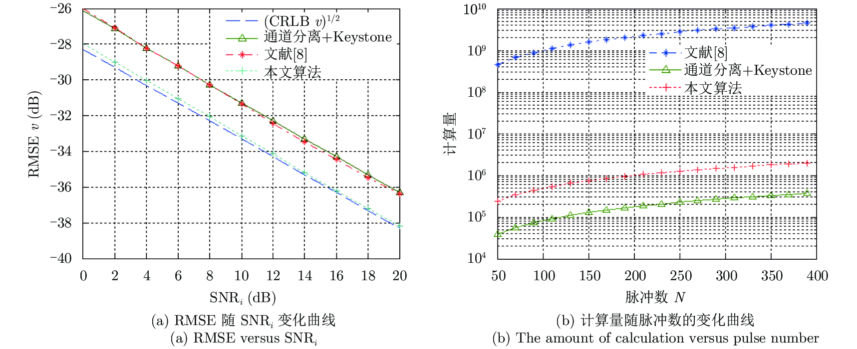 由图5(a)可知,文献[8](点划线)与基于通道分离和Keystone相结合的方法(实线)的速度估计的RMSE曲线变化趋势类似。在相同的估计精度下,与上述两种方法相比,本文基于通道分离的近似最大似然估计法(点线)的输入信噪比