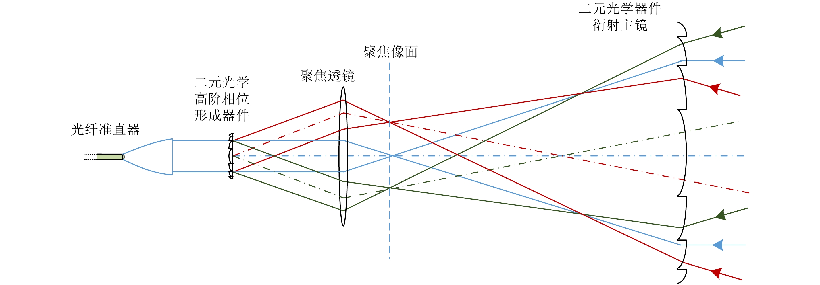 图 10 SAL主镜和宽视场馈源都采用二元光学器件的衍射光学系统示意图 Fig.10 Diagram of diffractive optical system in which the binary optical element is used both on the feeder and primary mirror |