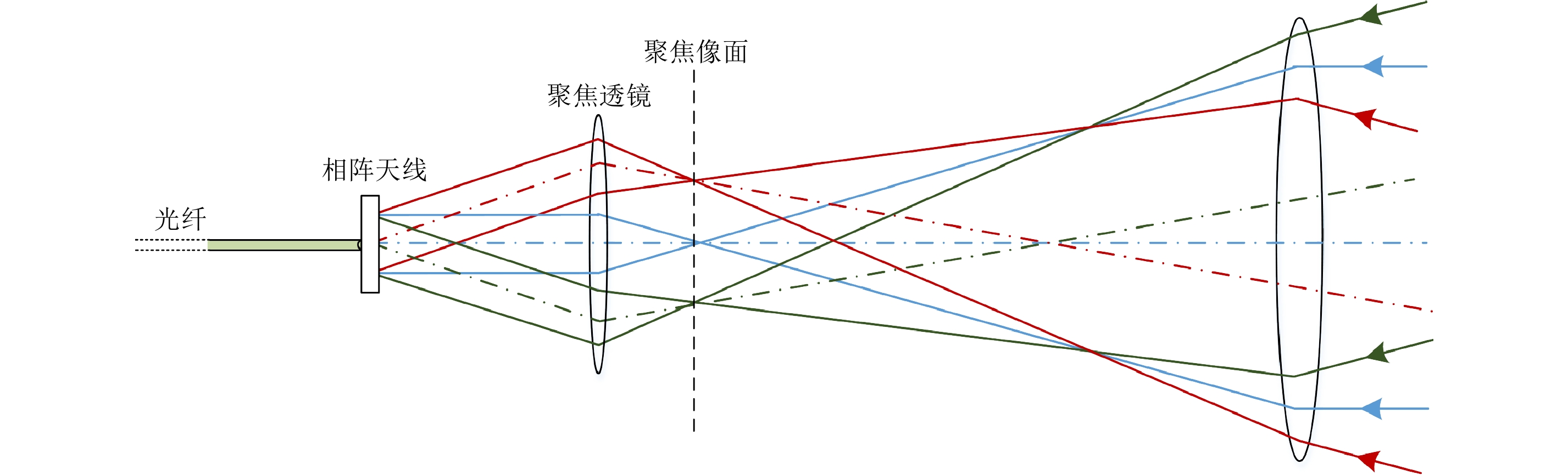 当本文SAL主镜使用二元光学器件时,通过衍射器件引入较大的移相量实现回波信号的波前控制和聚焦,形成的衍射光学系统性能也能够使用相控阵模型给予分析。图10给出了SAL主镜和宽视场馈源都采用二元光学器件的衍射光学系统示意图。