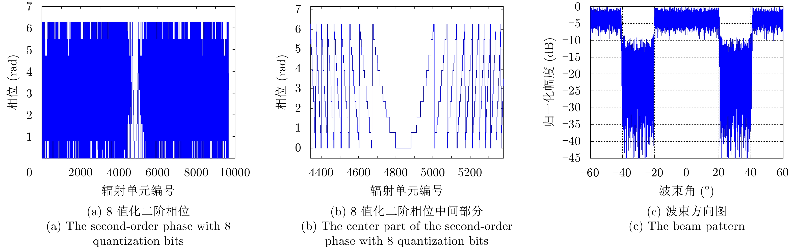 图 8 8值化2阶相位和对应的波束方向图展宽情况 Fig.8 Second-order phase with 8 quantization bits and the related broading beam pattern |