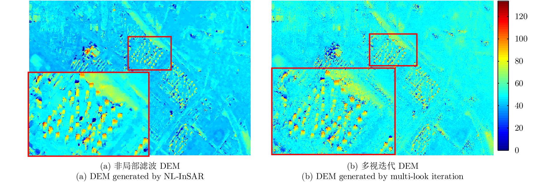 为了降低相位解缠的难度,减少相位解缠误差,利用外部DEM进行差分处理,削弱区域地形引起的密集条纹。根据SAR系统参数、轨道参数等,利用外部DEM仿真SAR图像,将仿真SAR图像与实际SAR图像配准,建立外部DEM与实际SAR图像的对应关系[13]。再利用外部DEM仿真干涉图,将原始干涉图与仿真干涉图进行差分干涉处理得到缠绕的差分干涉图,解缠差分干涉图,并加上原来的仿真干涉图,得到原始干涉图的解缠相位。最后根据InSAR几何关系模型反演高度,再进行地理编码得到升降轨DEM。采用文献[10]中多视迭代的方法,本文也进行了多视迭代的实验,结果如图10(b)所示,可以看到采用NL-InSAR相位滤波得到的结果细节更加清晰,且只进行一次多视处理,处理过程快速简单。