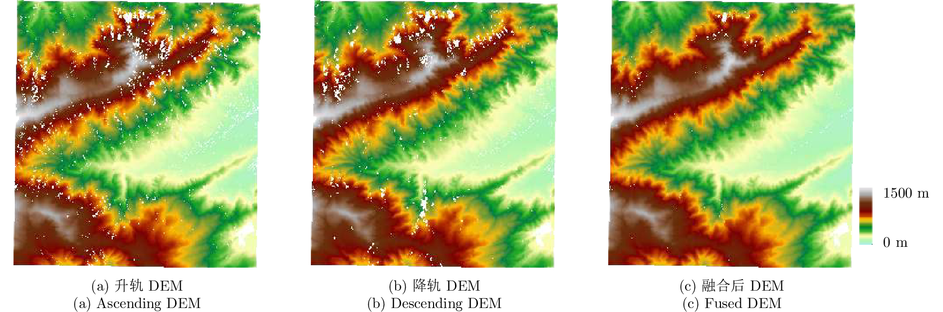 在地形复杂区域,数据受叠掩和阴影影响的无效区域较多,因此利用升轨和降轨分别重建的DEM互相融合从而恢复无效区域。升降轨数据处理分别得到各自的DEM,将其地理编码到WGS84坐标系下,根据经纬度信息提取出公共部分,如图11所示。为了进一步提升升降轨DEM配准精度,同样将升降轨幅度进行地理编码,将地理编码后的升降轨幅度进行配准,使用最小二乘得到拟合的多项式系数,使用该多项式系数实现对升降轨DEM的配准。升轨的无效点数占总共的4.93%,降轨数据占4.52%,升轨数据无效区域相对于降轨数据较高的原因是由于其入射角低于降轨数据,因此实验区域有更多的像素点由于坡度角超过入射角而受到叠掩阴影等的影响。将升降轨的无效区域互相恢复之后,得到如图12、图13所示融合后的部分DEM结果,图中可以明显看到无效区域的减少。统计结果如表3中所示,融合之后无效区域比例减少到1.34%。