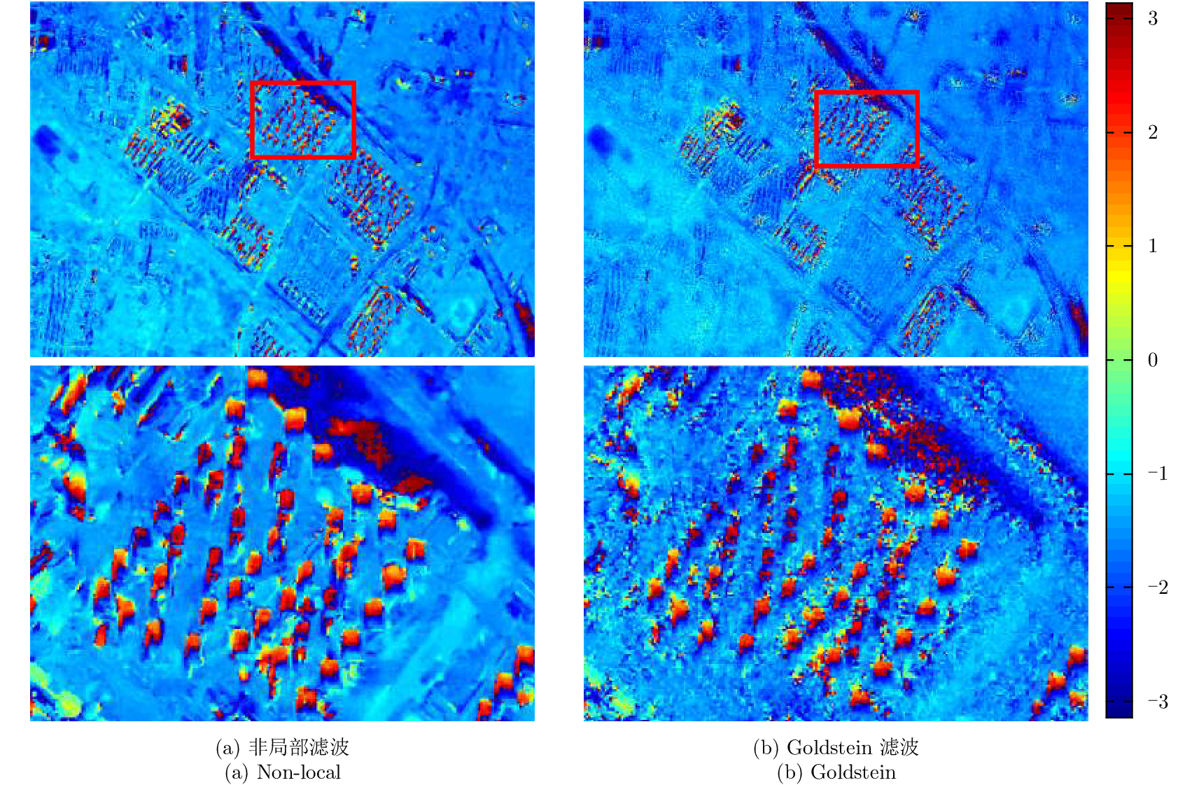 首先采用NL-InSAR滤波,并与目前在InSAR中应用较多的Goldstein滤波进行比较。得到的滤波效果图如图8所示,图8(a)是NL滤波的结果,图8(b)是Goldstein滤波的结果,从中可以明显看出,NL-InSAR滤波效果较好,在有效抑制噪声的同时对于细节特征的保持更为丰富;而基于窗口的Goldstein滤波含噪更多,在人造建筑区域如道路和建筑的细节损失较为明显。