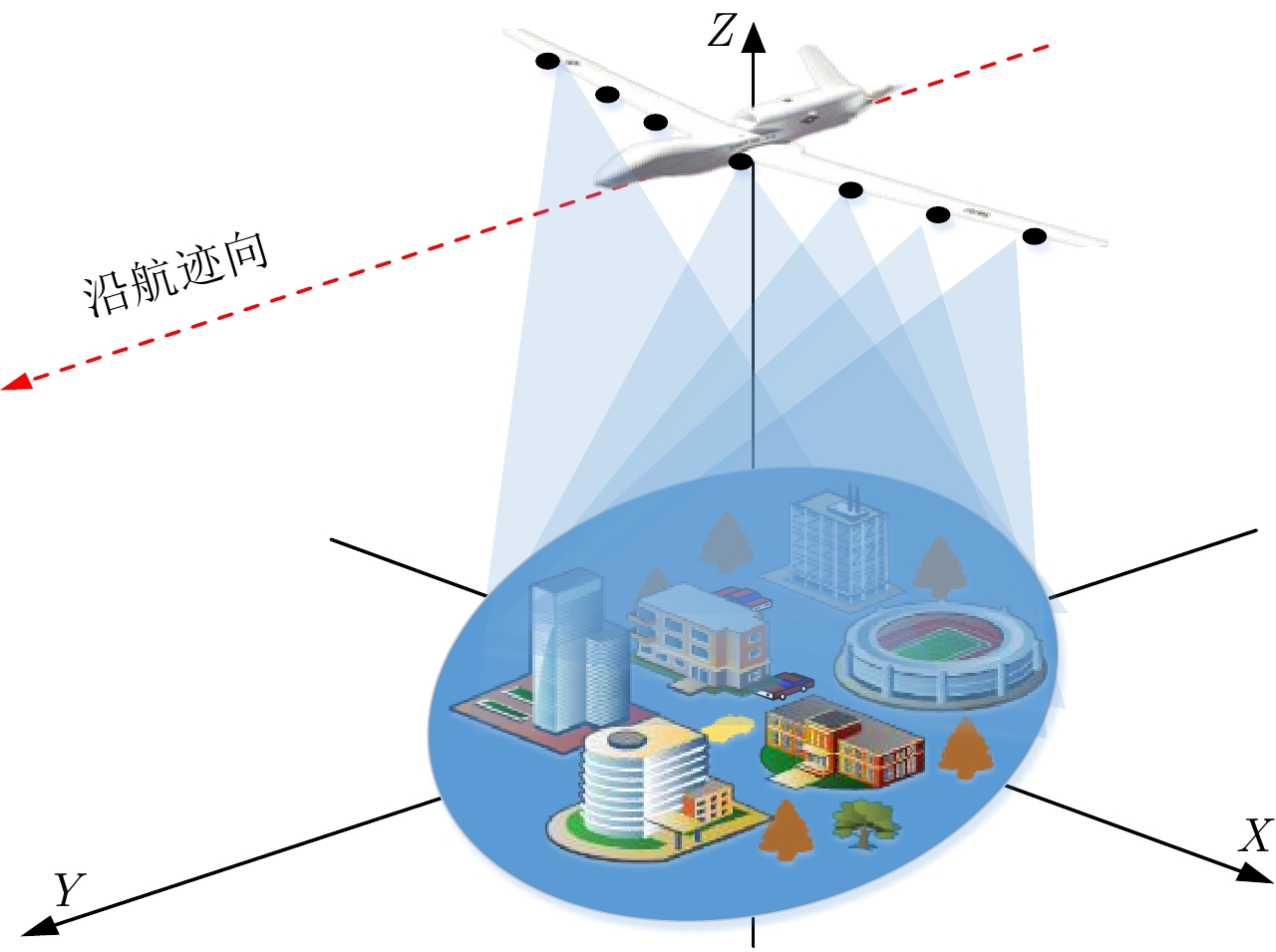 由于具备全天时、全天候、高分辨3维成像能力,阵列合成孔径雷达(Linear Array Synthetic Aperture Radar, LASAR) 3维成像技术是近几年来被广泛关注的一种新型合成孔径雷达(Synthetic Aperture Radar, SAR)成像技术[1–3]。LASAR是传统2维SAR成像的扩展,主要通过控制阵列天线在空间中运动形成虚拟2维面阵获得观测目标2维分辨,并结合脉冲压缩技术得到观测目标的第3维分辨,最终实现观测目标的3维成像。LASAR具有灵活的成像模式,可实现侧视、斜视、下视和前视等多模式成像。相比于层析SAR或圆周SAR通常只工作在传统侧视、斜视成像模式,下视和前视等多模式成像可以克服常规SAR成像的几何失真、左右模糊以及阴影效应等问题,不易丢失观测场景某些重点区域目标信息。因此,LASAR对实现复杂起伏场景(城市、山区等)及特殊目标(建筑、舰船、坦克等)的高精度3维成像具有显著优势,在全天候全天时3维地形测绘、飞行器导航及盲降、目标精定位与识别、军事侦察、战场信息获取等国防军事和资源管理领域有着极大的研究价值和应用前景。由于阵列天线尺寸及载荷平台空间限制,基于经典匹配滤波理论的传统成像算法受分辨率瑞利准则约束,在阵列天线分布的维向难以实现高分辨成像,且成像结果存在主瓣旁瓣模糊,弱散射目标容易被邻近强散射目标旁瓣掩盖,导致LASAR 3维图像质量降低[4],应用受限。