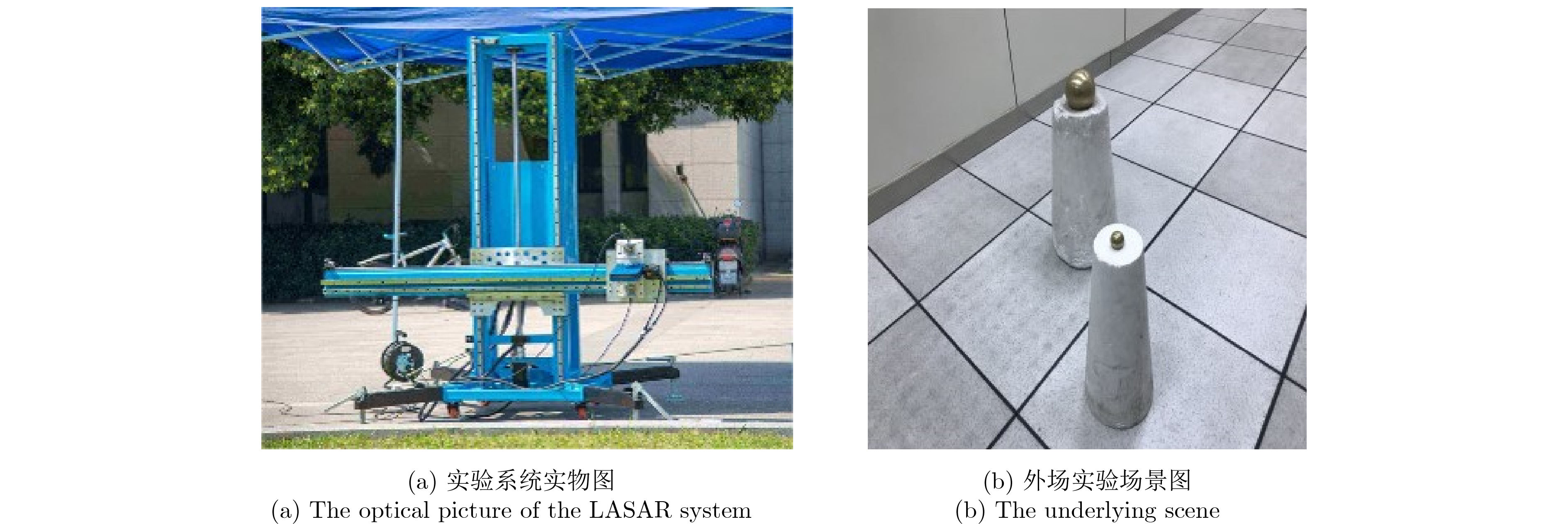 4.2 实测数据为了继续验证本文算法的有效性,利用本课题组地基等效LASAR实验系统获取的实测数据进行成像分析。地基等效LASAR实验系统实物图如图7(a)所示,系统主要参数如下:雷达中心频率