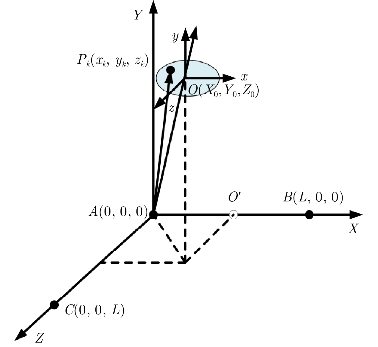 L型三天线构型的干涉3维成像的结构如图1所示,图中包含两个坐标系,即雷达坐标系(A-XYZ)和目标坐标系(O-xyz)。3部天线在雷达坐标系下的位置分别为A(0, 0, 0), B(L, 0, 0), C(0, 0, L),其中L表示成像系统的基线长度,而且基线AB和AC互相垂直。且仅仅A天线为发射天线,A, B和C 3部天线都接收目标回波。