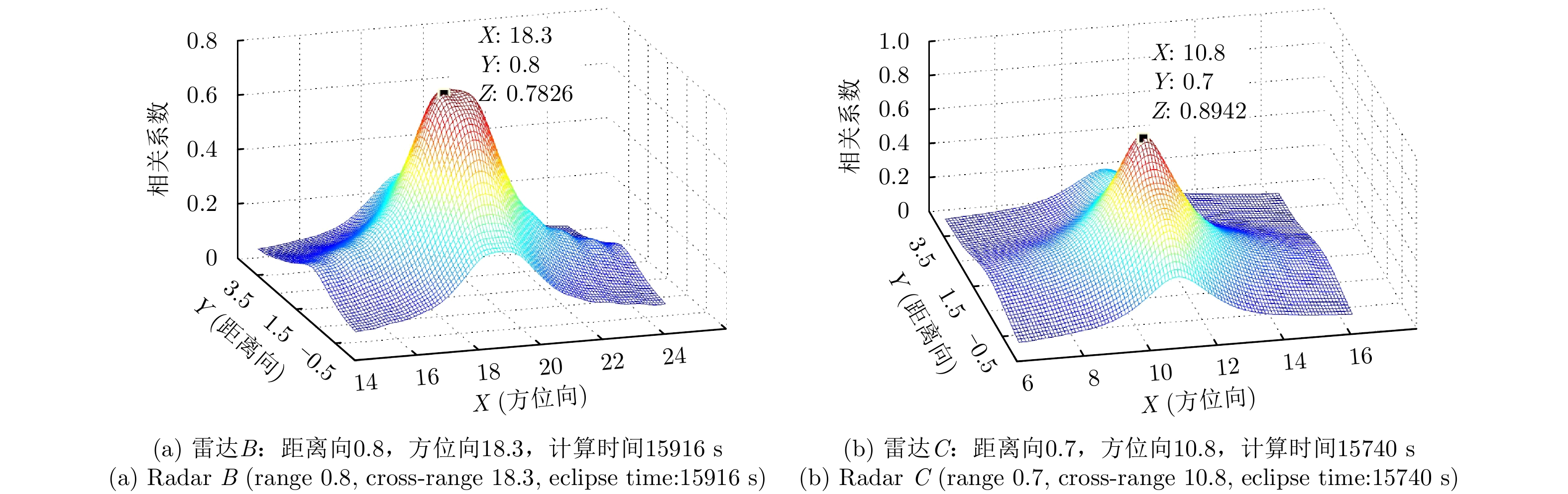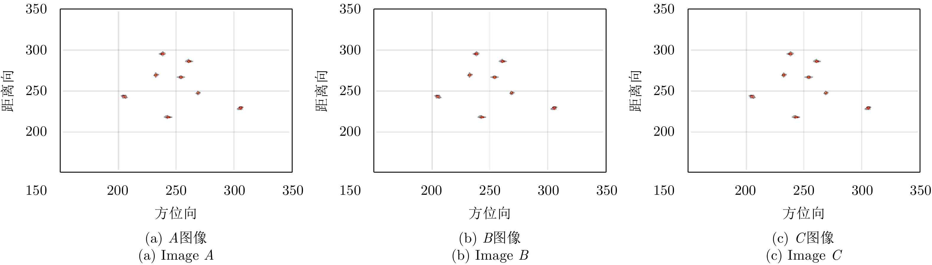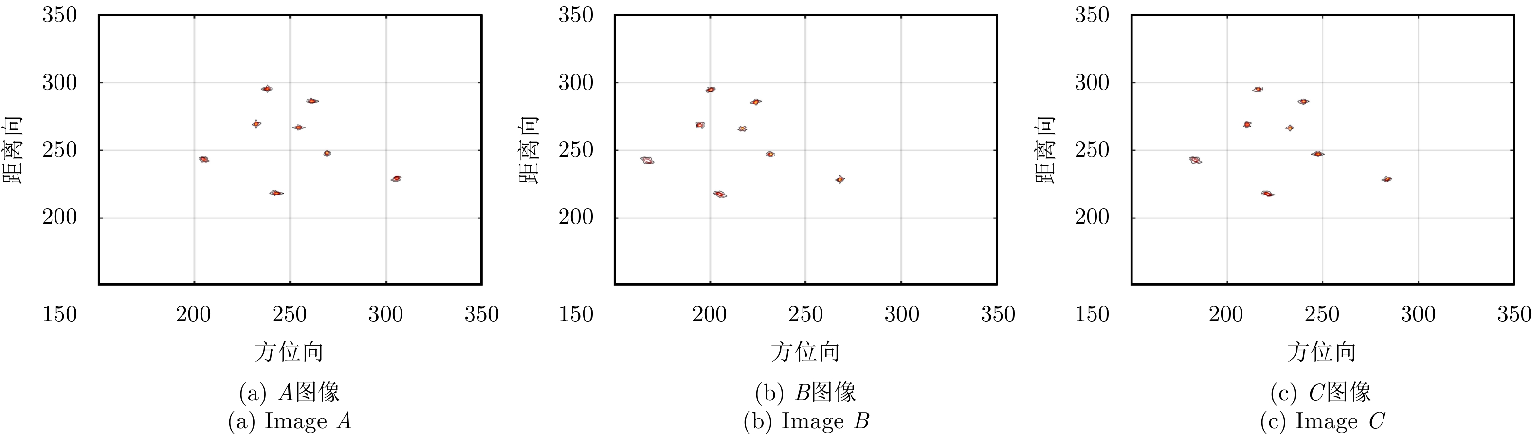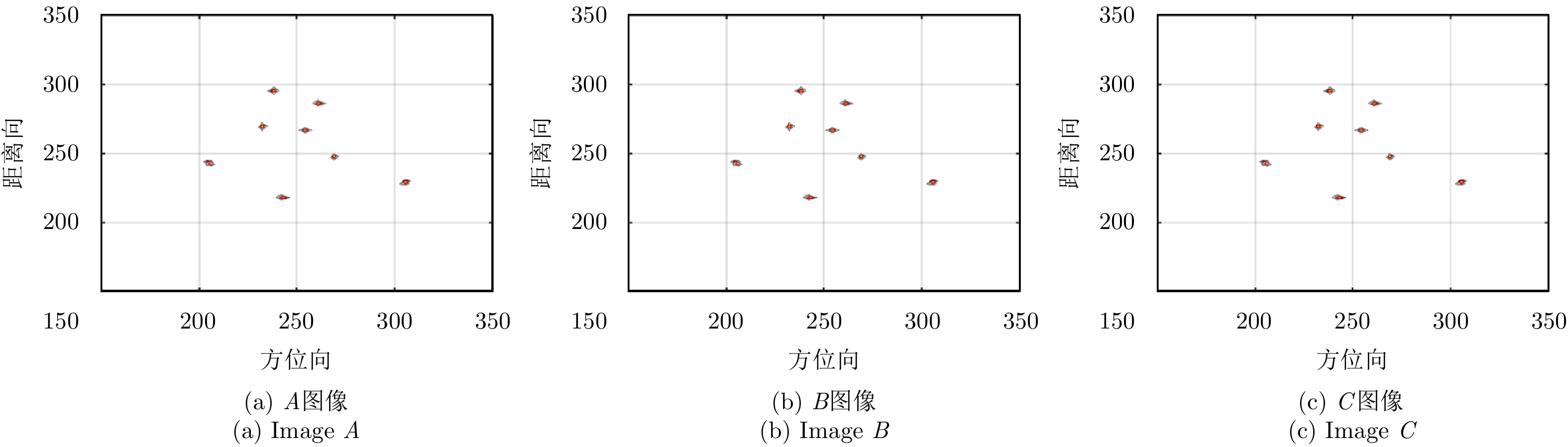 按传统RD成像方法对回波依次进行距离向脉冲压缩,包络对齐,初相校正,方位向脉冲压缩得到目标的ISAR图像。然后分别对B和C的图像逐步进行距离向和方位向的平移,并计算相关系数。该仿真实验在设备参数为Intel(R) Core(TM) i7 7700 CPU @ 3.6 GHz and 16 GB RAM计算机的MATLAB环境中进行,相关系数计算结果如图13所示。其中A, B相关系数的计算用时为15916 s, A, C相关系数的计算用时为15740 s;当B图像距离向平移量为0.8,方位向平移量为18.3时,A和B图像的相关系数达到最大;当C图像距离向平移量为0.7,方位向平移量为10.8时,A和C图像的相关系数达到最大。在实验过程中,为了达到十分之一个像素单元的配准精度,需要对原始图像进行10倍插值处理,另外,还需要搜索距离向和方位向的最佳平移量,这将极大地增加相关法的计算量,因此基于相关系数的图像配准方法的计算时间较长。根据B和C图像的最佳平移量对B和C图像进行平移,平移过后的ISAR图像如图14所示,从左至右依次为A, B, C图像。同样,可以使用峰值检测的方法提取出3幅图像中的强散射点,如表3所示。根据表3可知,有的散射点在3幅图像中的位置并不是同一个像素单元,8个强散射点并没有完全对齐,可见相关法的配准精度相对较差。因为ISAR图像中目标所占的区域相对较小,大部分像素单元都是被噪声占据,目标散射信息对相关系数的贡献值相对较小,所以两幅图像的相关系数更有可能被噪声所影响,尤其是在信噪比较低的观测条件下。最终导致基于相关系数的ISAR图像配准方法的配准精度较差,容易形成错配现象。