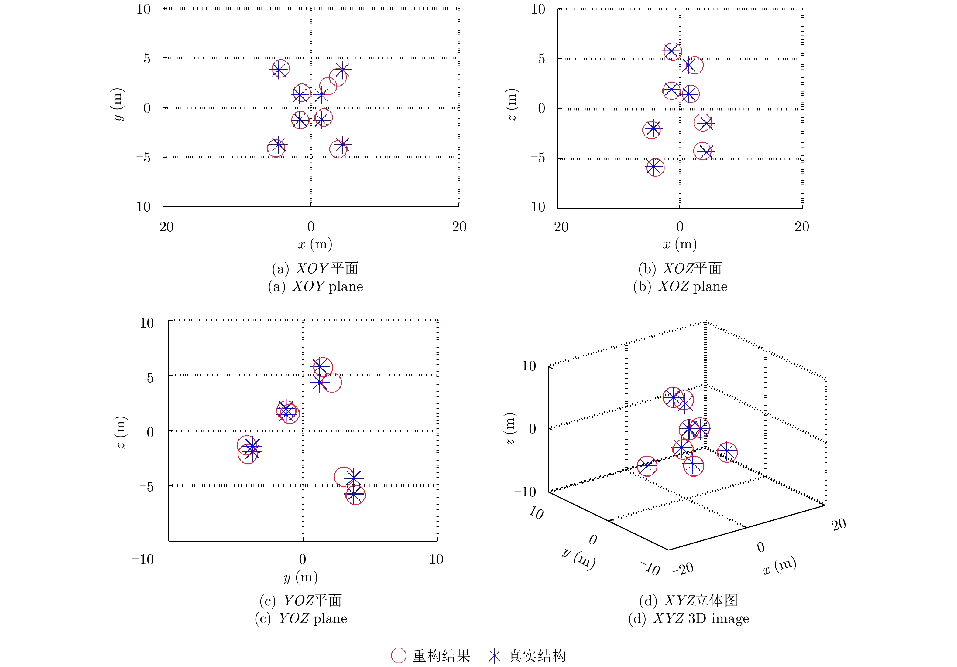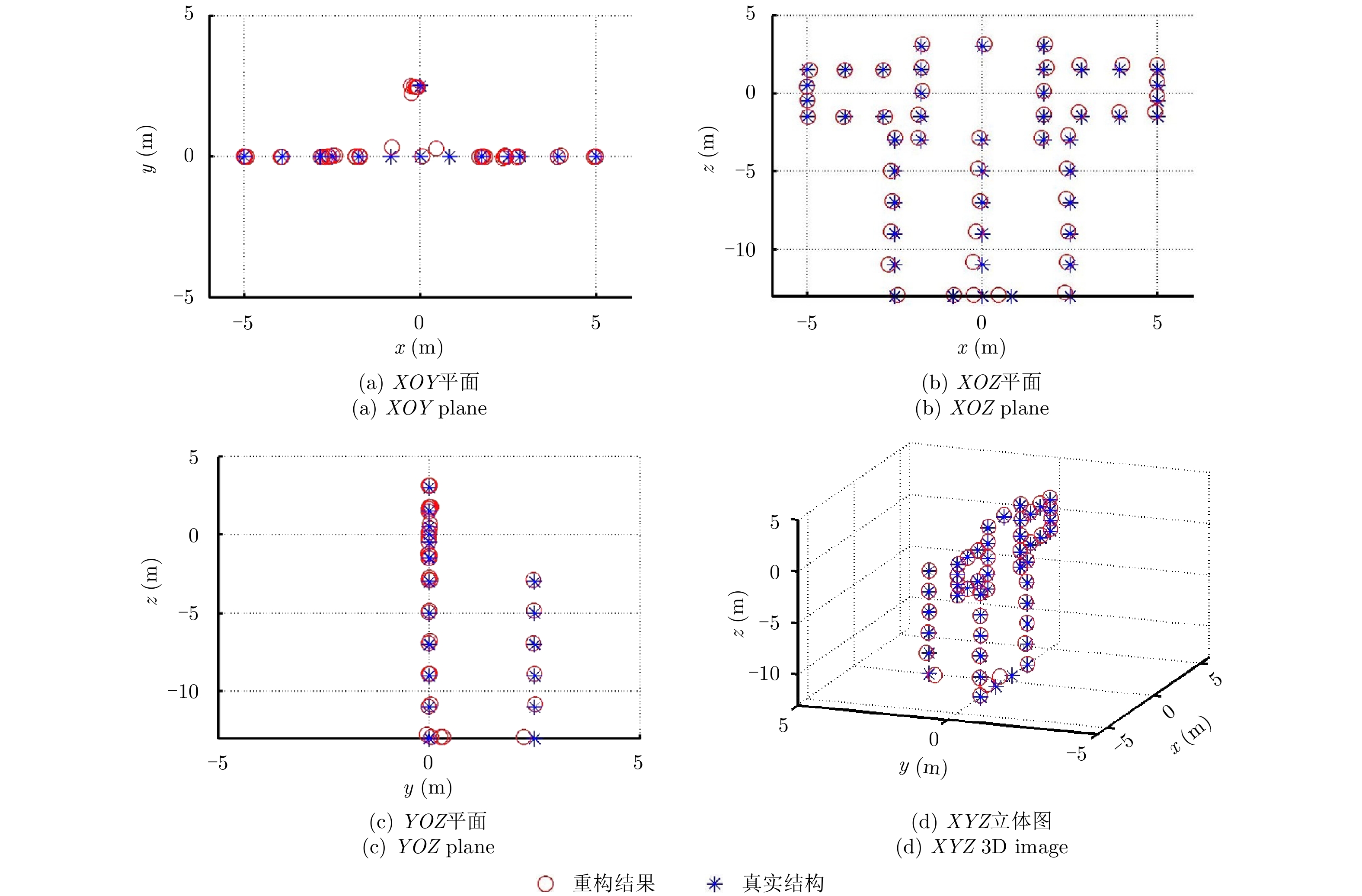 根据上述算法流程,对“天宫一号”散射点模型进行InISAR成像,成像结果如图18所示,其中蓝色“*”点表示目标的真实结构,红色圆圈“○”表示使用波程差补偿方法得到的3维成像结果。因为ISAR图像配准只是InISAR成像的中间步骤,因此这里直接采用最终的InISAR成像结果来衡量算法性能。由成像结果在XOZ平面的投影可见,目标真实结构的投影与成像结果的投影比较一致,成像结果在XOZ平面与真实结构吻合得比较好;再根据YOZ平面的结构可知,干涉结果在y坐标方向上也基本吻合,误差较小,所以,总体而言最终的3维成像质量比较好。可见,所提出的算法对于较复杂的散射点模型也能得出较好的成像效果,由此可见所提出的基于波程差补偿的ISAR图像配准方法可以很好地实现ISAR图像配准,并获得质量较好的InISAR 3维成像结果。
