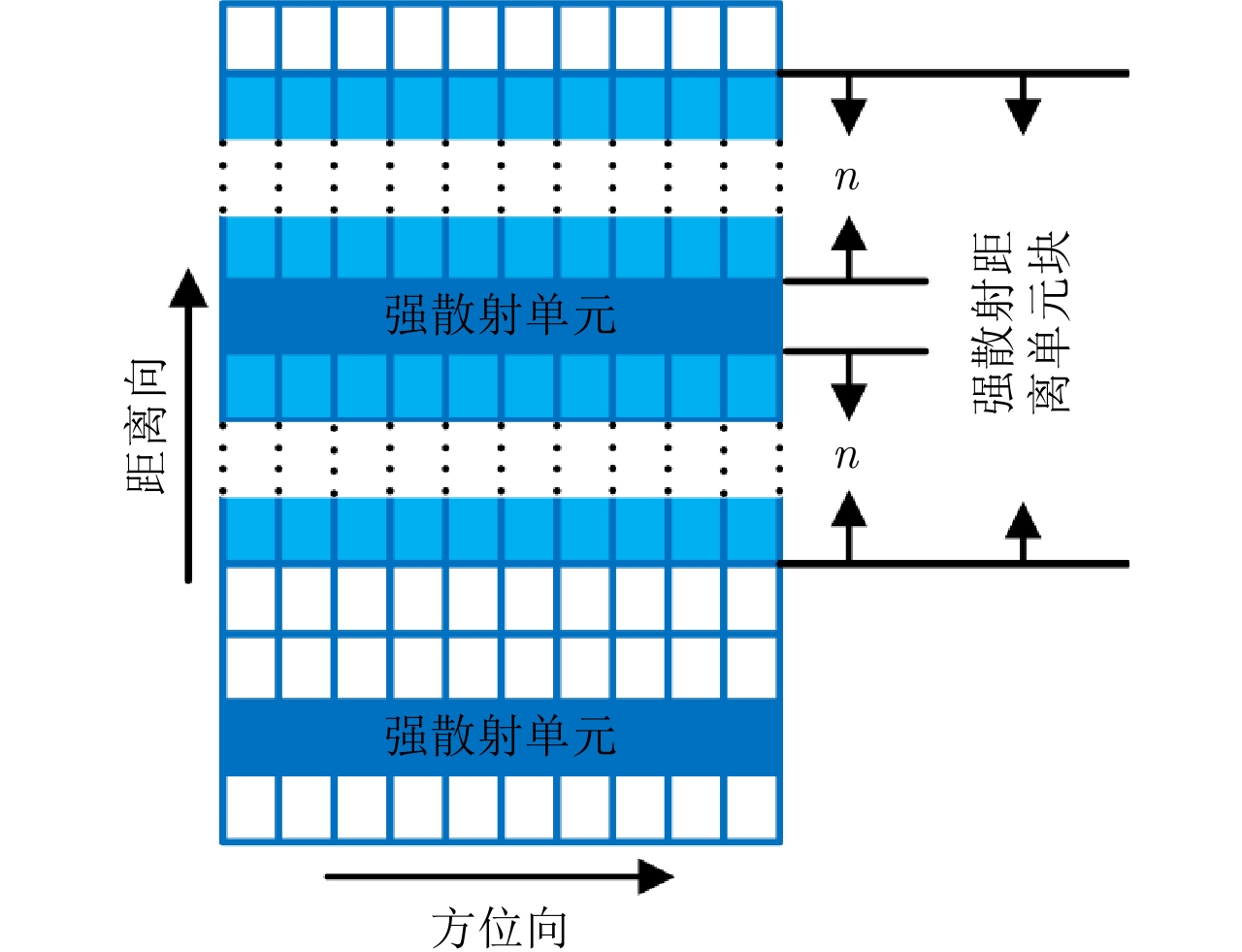 其中,强散射单元块由2n+1个1维方位像组成,分别为强散射点单元所在的1维方位像,以及其前后各n个距离单元的1维方位像。具体的强散射单元块的组成如图4中阴影部分所示。此处选择强散射单元块遵循两个原则:(1)充分利用强散射单元的峰值的旁瓣信息;(2)同一个强散射单元块不同时包含两个强散射单元。