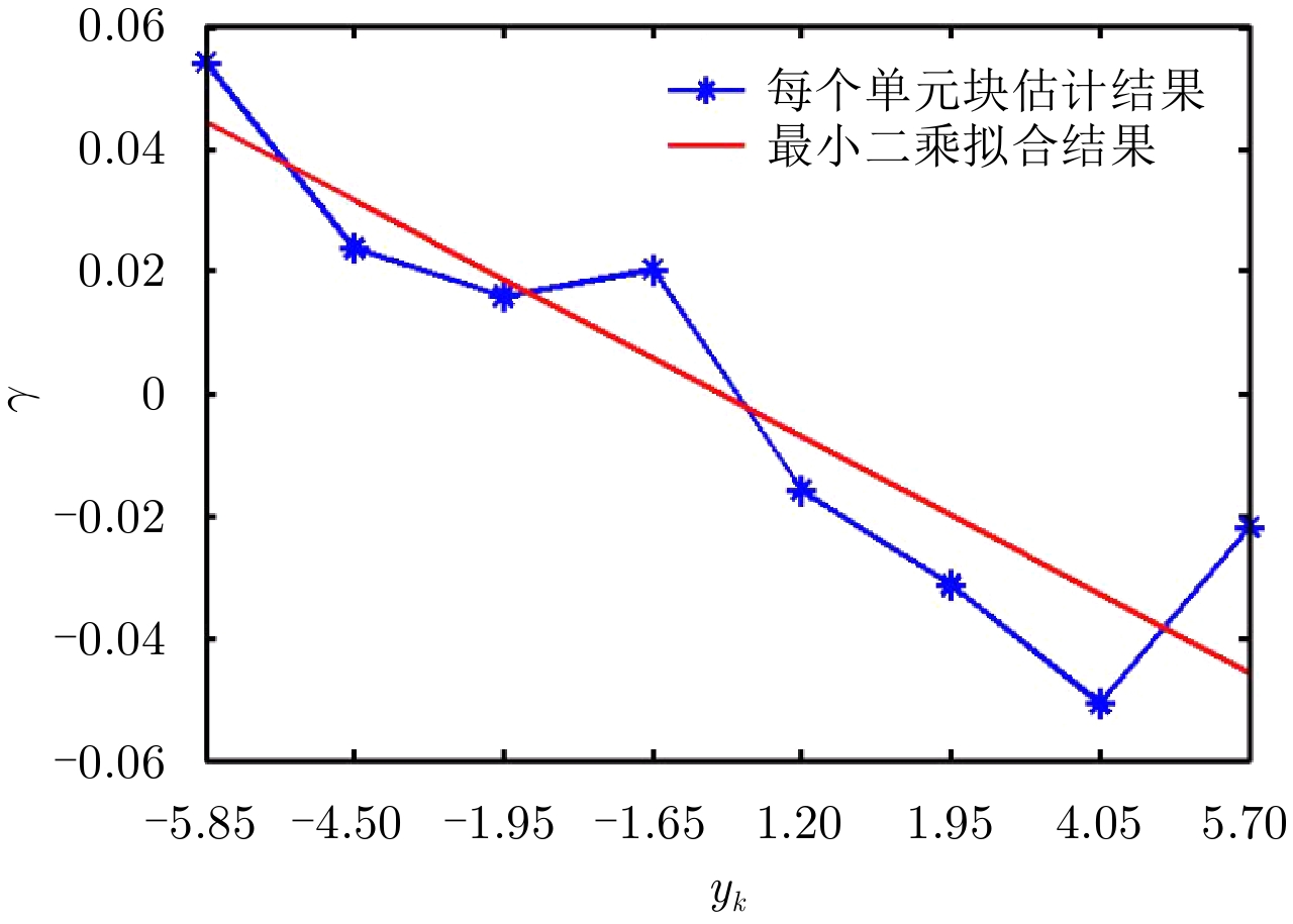 估计结果如图6所示,蓝色线为调频傅里叶变换之后用最小熵法搜索得到的各距离单元块的调频斜率估计结果,红色线为最小二乘拟合的结果。计算红线的斜率即可计算得到目标的旋转角速度: