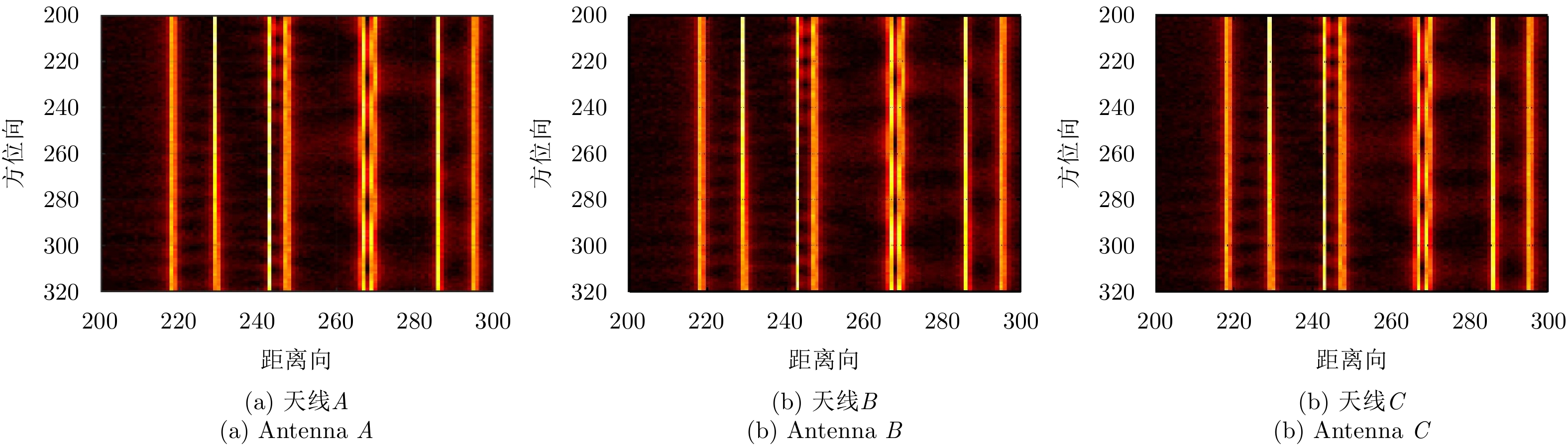 进行解线频调处理并成像时,B图像和A图像以及C图像和A图像之间的失配准现象比较严重。但是,用雷达B和雷达C到目标的距离分别对各自回波进行解线频调处理时,即