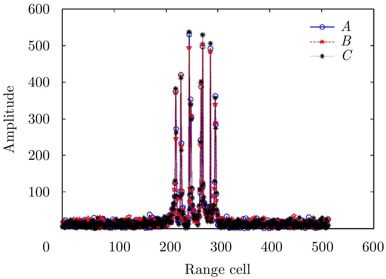 图8所示为各天线经过波程差补偿的回波进行距离压缩得到的目标的1维距离像。显然,3部天线得到的3幅1维距离像极其相似,强散射点基本位于相同的距离单元,忽略噪声的影响,可以认为距离向上基本实现配准。另外,图9给出了雷达A, B和C回波的第50次脉冲对齐之后1维距离像的比较结果,峰值点表示散射点位置,并且峰值对齐效果较好,可见散射点在距离向基本实现精确对齐。