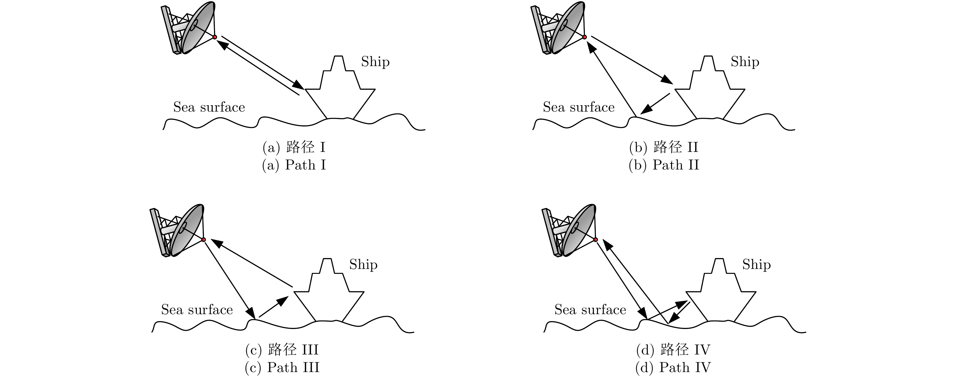 2.1 基于“4路径”模型和射线管积分技术的海面舰船目标3维快速ISAR成像2001年,Johnson等人[29,30]提出了“4路径”模型用于计算粗糙面上目标的本体散射,以及目标与粗糙面之间的耦合散射。图1为“4路径”模型计算目标与海面复合散射的示意图,考虑4种多路径散射机理:图1(a)为目标本体的散射贡献(路径I);图1(b)为目标-海面的2次反射贡献(路径II);图1(c)为海面-目标的2次反射贡献(路径III);图1(d)为海面-目标-海面的3次反射贡献(路径IV)。其中路径II, III, IV对应目标-海面间的耦合散射,涉及粗糙海面散射。传统基于海面面元的弹跳射线(Shooting and Bouncing Ray, SBR)方法[9,29,30],需要追踪海量的射线,计算量巨大。本文参考董纯柱等人[27,28]提出的“准镜像”处理方法,该方法无需建立海面面元模型,能够高效地计算随机微粗糙环境表面上复杂目标的高频电磁散射特性。