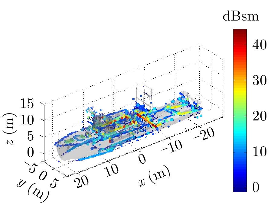 4 实验、分析与验证基于前面所提算法,以典型舰船目标为例,计算海面舰船目标3维散射中心分布,通过比较3维散射中心重建的与直接仿真的1维距离像、2维ISAR来验证本文算法的有效性,并通过与传统基于FFT方法生成3维散射中心的计算耗时对比,说明本文所提算法在计算效率上的优势。评估本文算法精度的电磁仿真方法将采用基于SBR技术的高频电磁计算技术[9,25–28]。