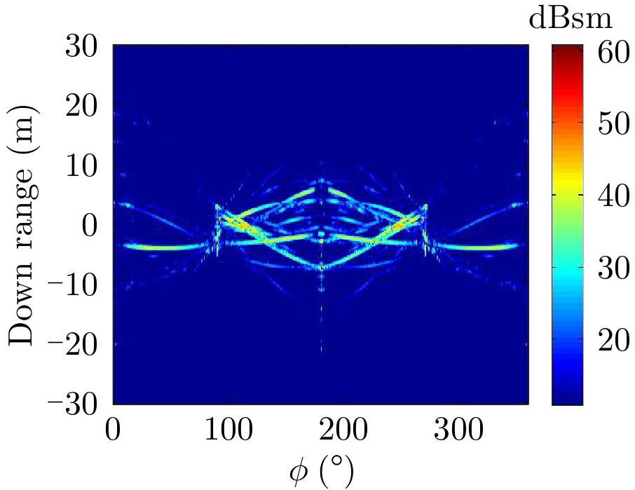 传统的图像域散射中心建模方法为获取高分辨率雷达目标图像,需进行较大数据量的扫频扫角目标RCS仿真计算,比较耗时。上述算法由于采用了射线管积分、“4路径”模型、修正Fresnel系数模型等技术,不但可实现在单频单视角下直接计算雷达目标3维图像,而且简化了目标与海面相互耦合计算,因而极大地减小了计算量,提高了计算效率。在下一节中将通过实际算例对算法的精度和计算效率进行验证。
