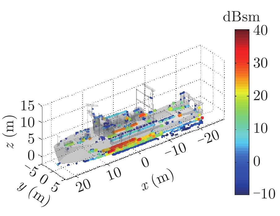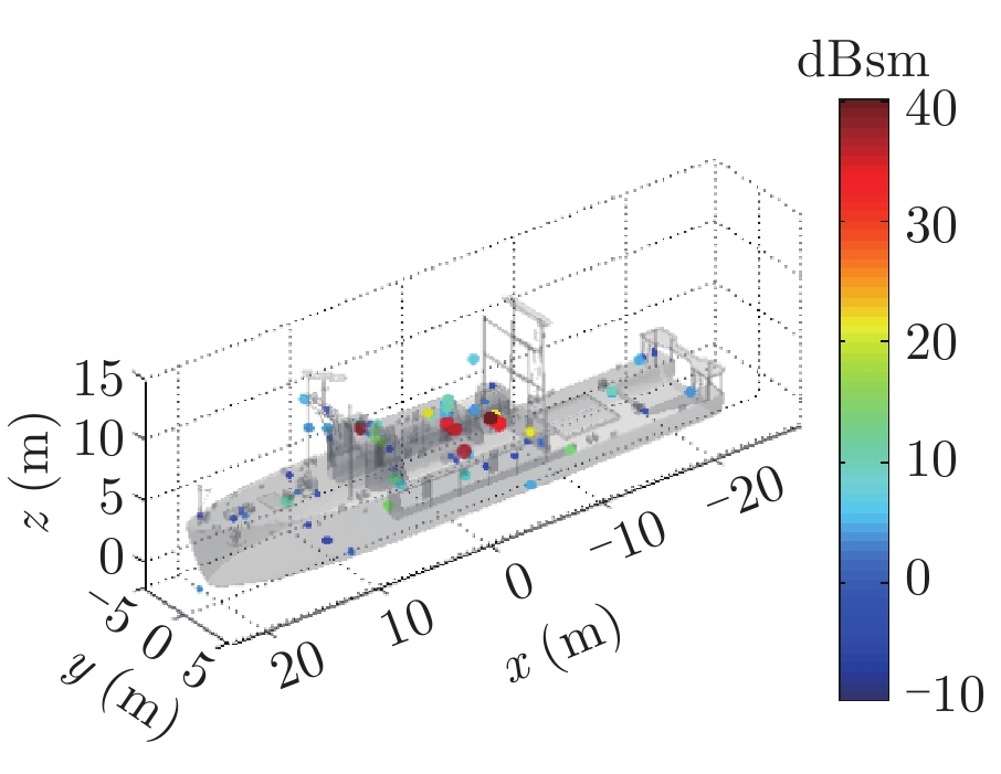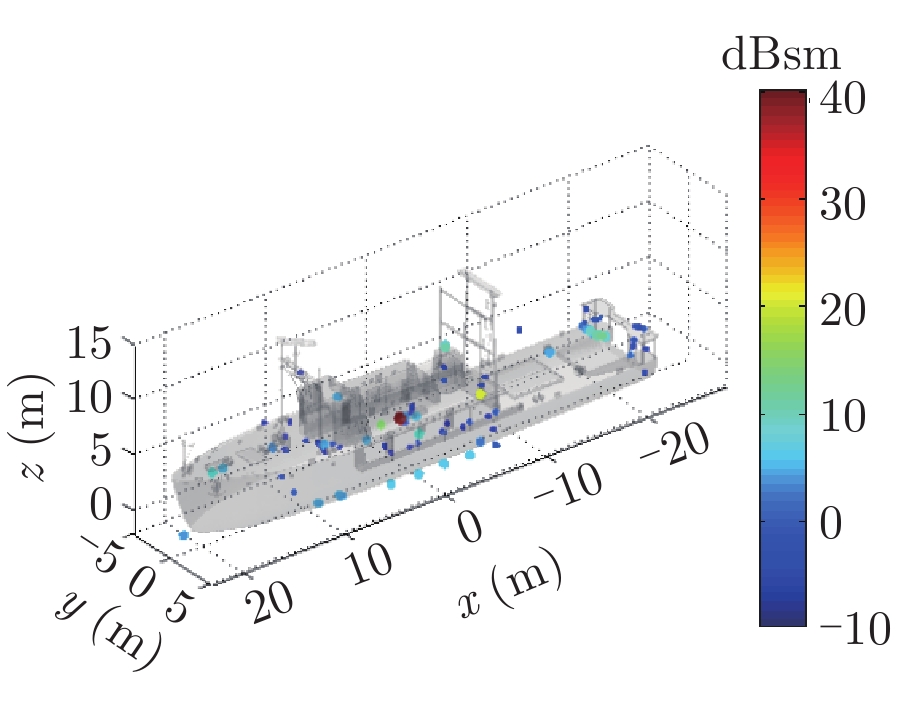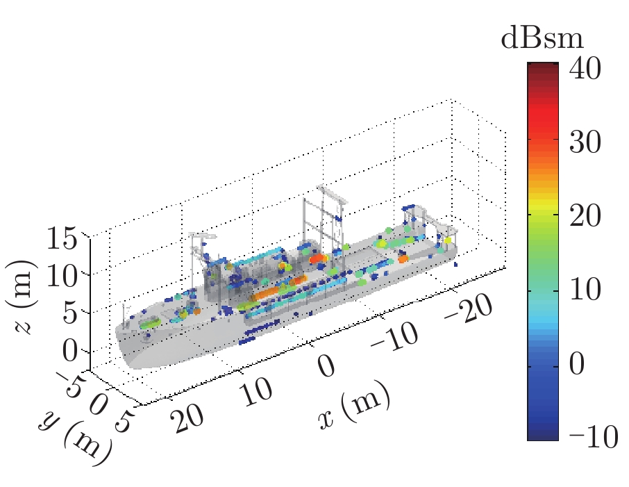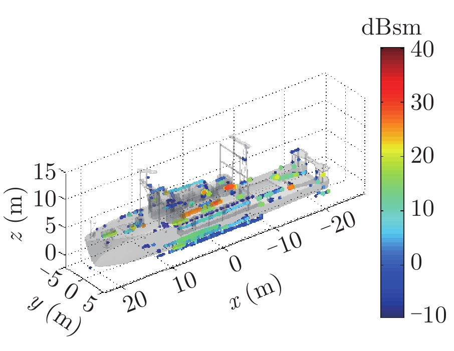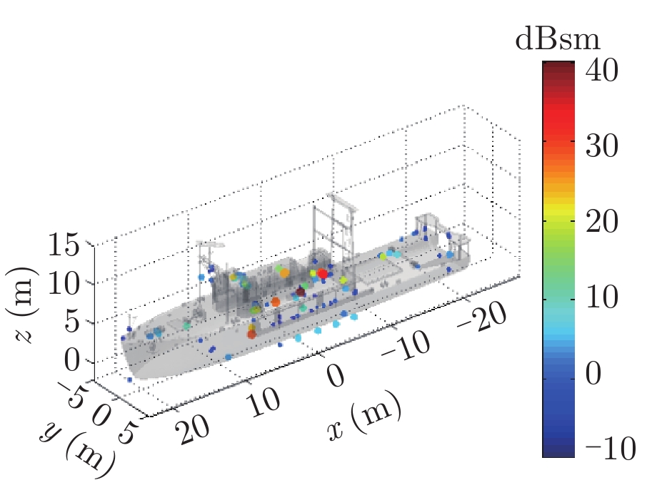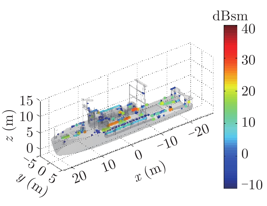 在高频区,雷达目标的总散射响应可由多个局部等效散射源响应的相干叠加来描述,这些局部散射源被称为目标的等效散射中心,简称散射中心[1,2]。参数化表示的目标散射中心模型由于具有形式简单、稀疏,且模型参数与几何、物理性质相关等优点,在雷达目标的快速信号仿真[3]、数据压缩[4]、隐身与特征控制[5],以及特征提取与自动目标识别(Automatic Target Recognition, ATR)[6–8]等领域均获得了广泛应用。近年来,随着我国海洋活动日益增加,舰船目标的雷达信号仿真、隐身设计、特征提取与识别等问题受到了越来越多的关注[9–11],同时,考虑到舰船目标属于超电大尺寸目标,又与实际海面环境相复合,因此研究海面舰船目标的散射中心建模方法具有重要的学术和应用价值。